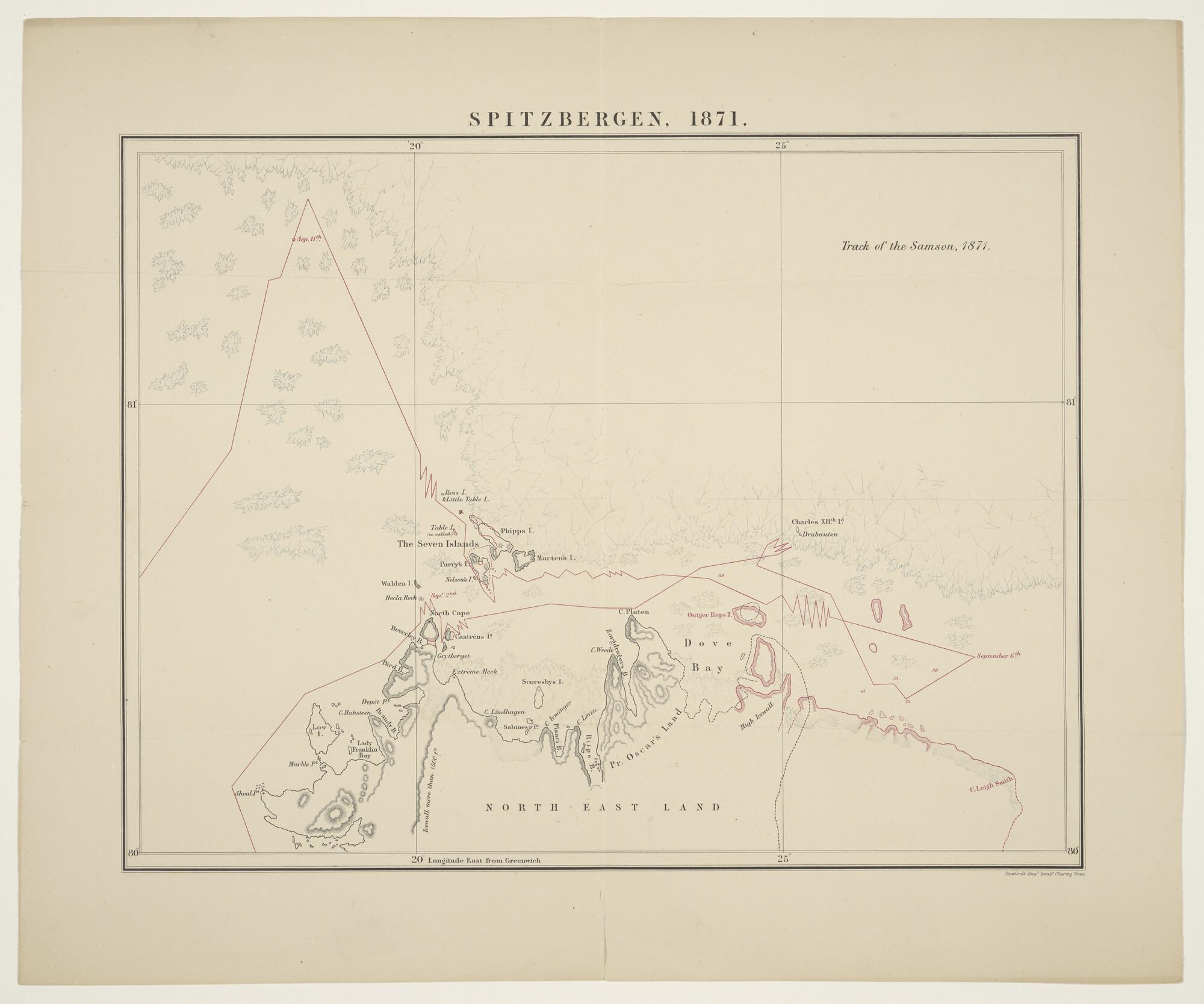 Gekleurde kaart van Spitsbergen uitgegeven door Stanford's Geographical Establishment te Londen, met de route van Benjamin Leigh Smith met de "Samson" in 1871.
