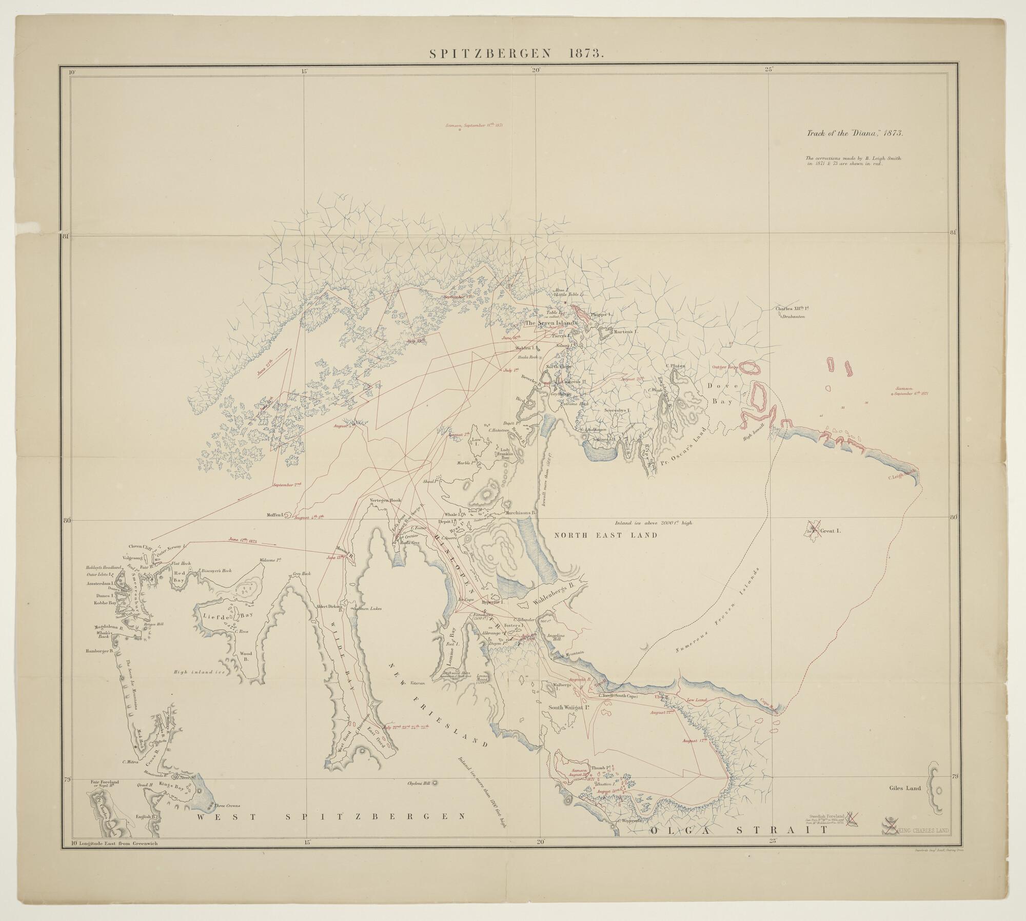 Gekleurde kaart van Spitsbergen uitgegeven door Stanford's Geographical Establishment te Londen, 1873, met de routes van de "Samson" en de "Diana" van Benjamin Leigh Smith in 1871 en 1873.