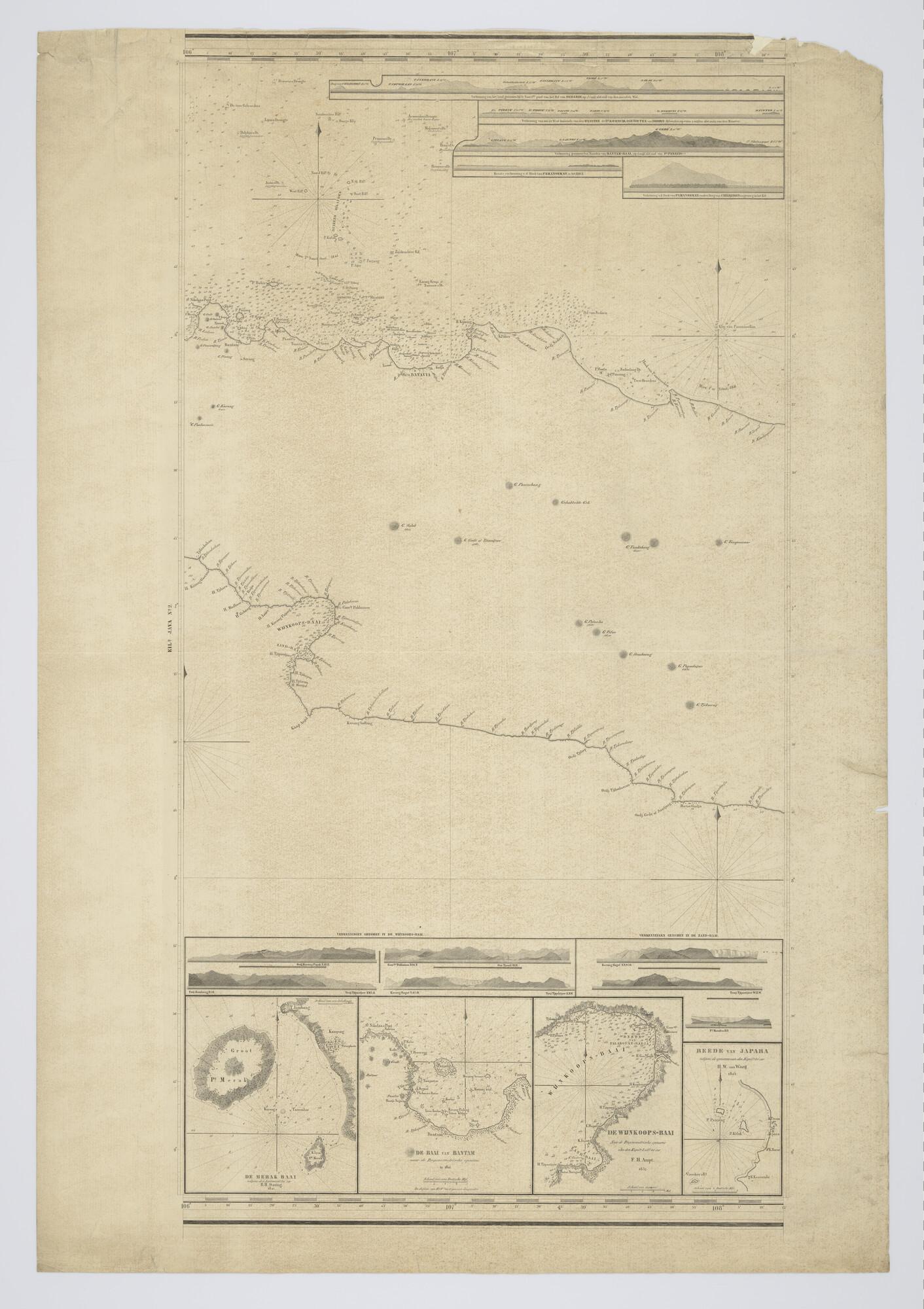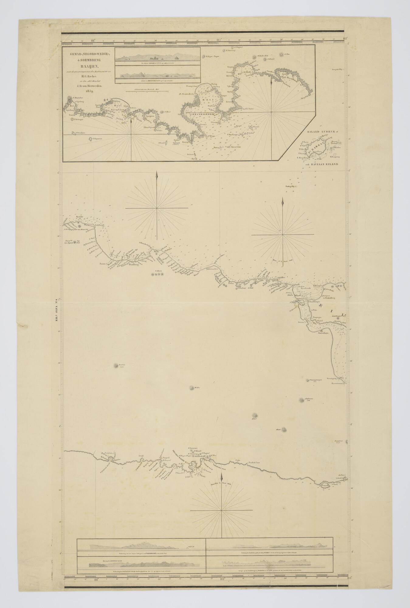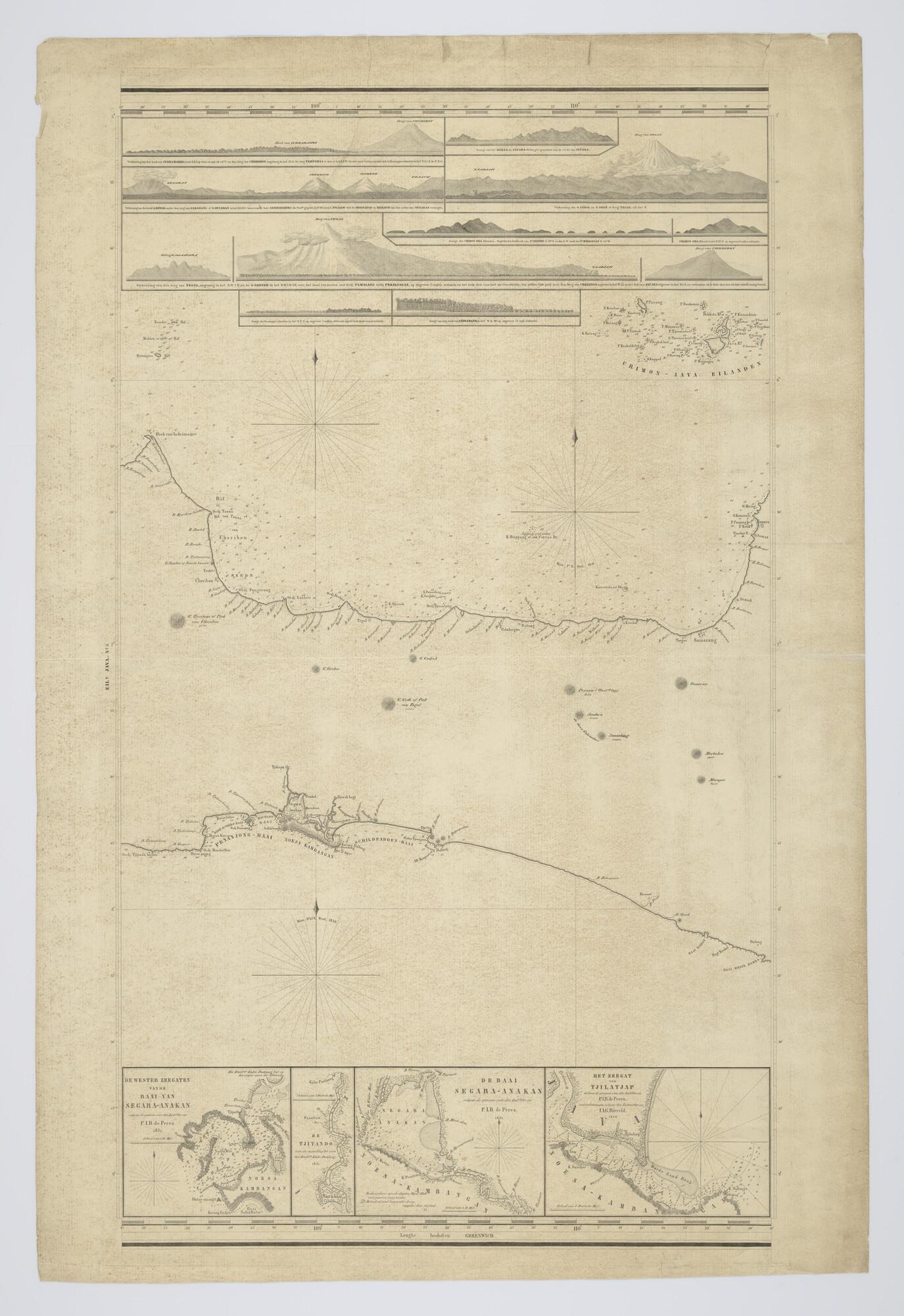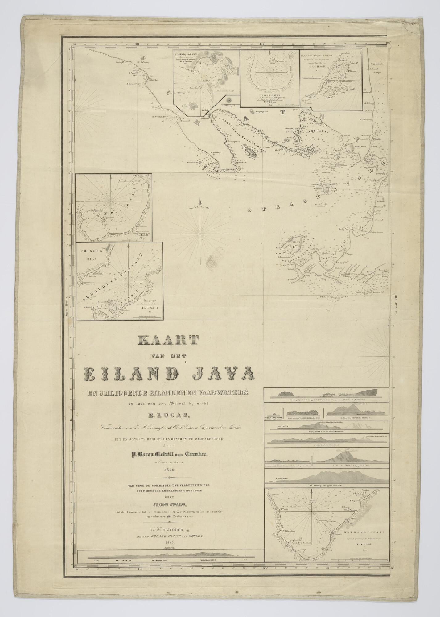 Kaart in 5 bladen van Java en omliggende eilanden door jhr P. Melvill van Carnbee opgenomen in opdracht van E. Lucas 1842. Gravure J.C. Zurcher, uitgave Jacob Swart, Wed. G. Hulst van Keulen, Amsterdam, 1845, verbeterd tot 1847. Lengte Greenwich. Schaal 1 op 175.000.