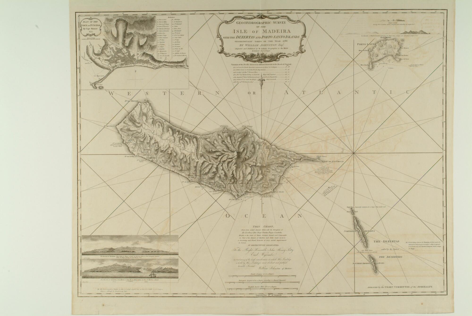 Kaart van het eiland Madeira en de Dezertas en Porto Santo Eilanden opgenomen in 1788 door William Johnston, opgedragen aan John Henry graaf Wycombe. Uitgave William Faden (1750-1836), Londen 1791. Detailkaart van Funchal. Lengte t.o.v. Greenwich. Inzetkaart (schaal 1 op 160.000).
