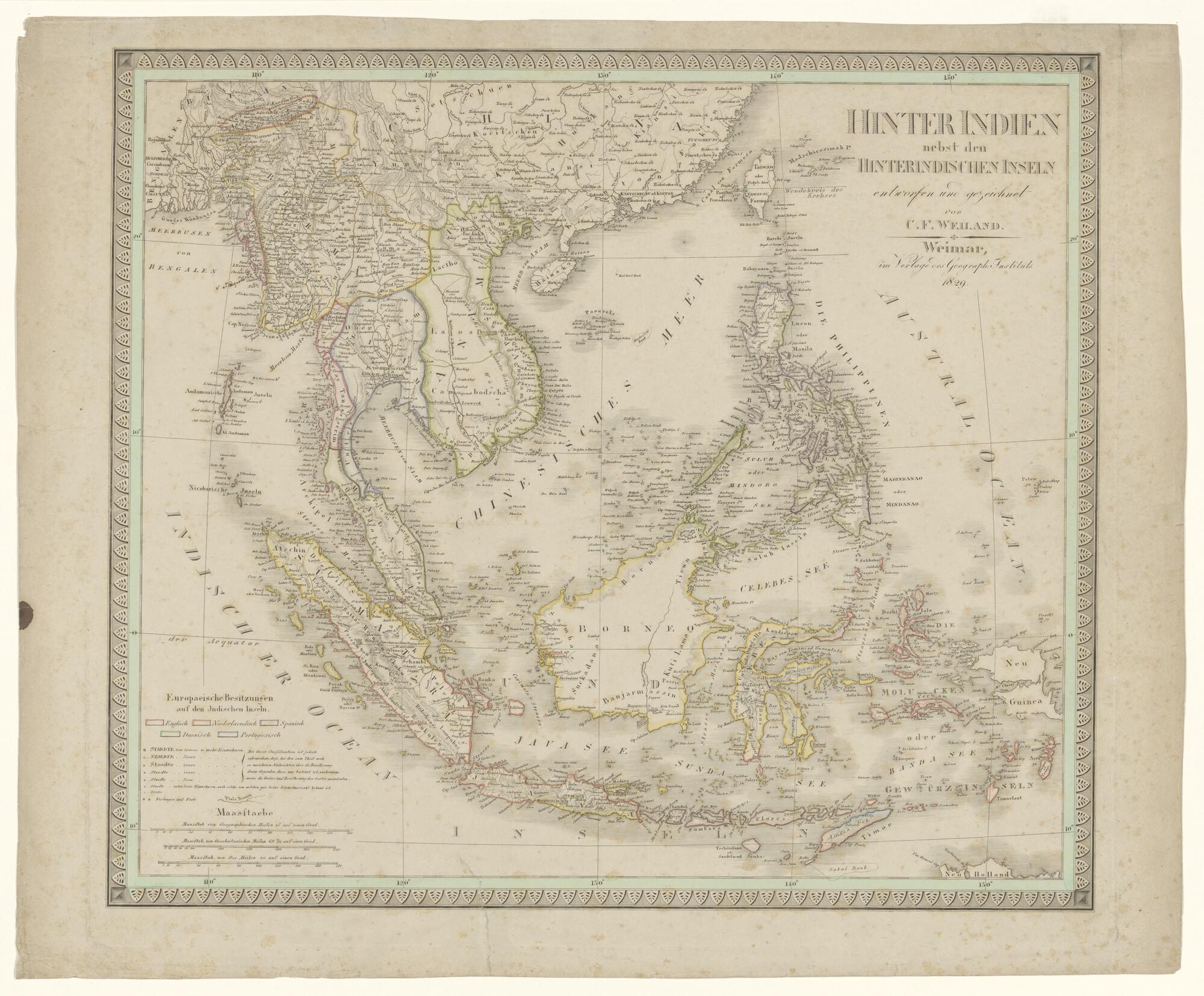 Met de hand gekleurde kaart van Achter-Indië Indonesië en de Filipijnen. Door Carl Ferdinand Weiland (1782-1847), uitgave Geographisches Institut, Weimar, 1829 (schaal 1 op 10.000.000).