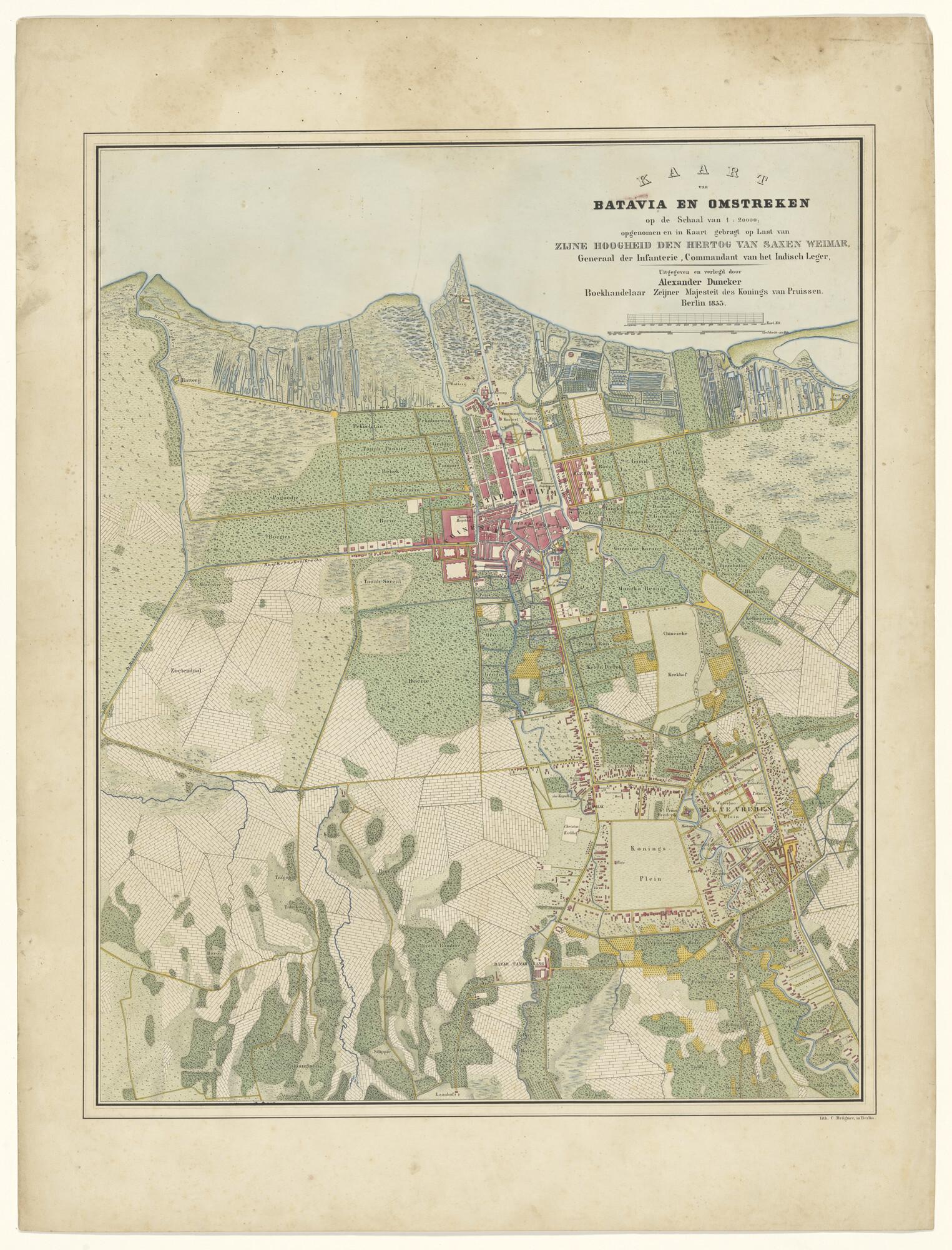 Gekleurde kaart van Batavia en omstreken door Alexander Duncker. Litografie C. Brügner, Berlijn, 1853, op last van de hertog van Saxen Weimar (schaal 1 op 20.000).