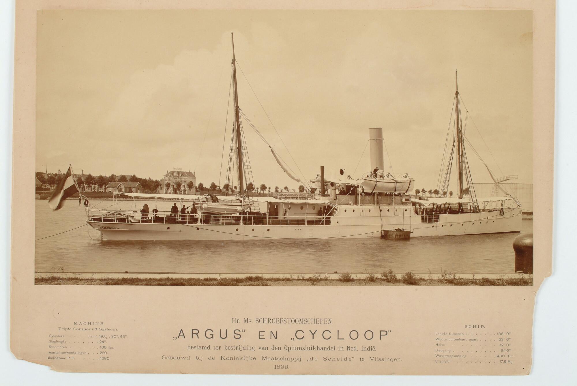 Het schroefstoomschip Zr.Ms. "Argus" (of "Cycloop") bestemd voor de bestrijding van de opiumsluikhandel, 1893.