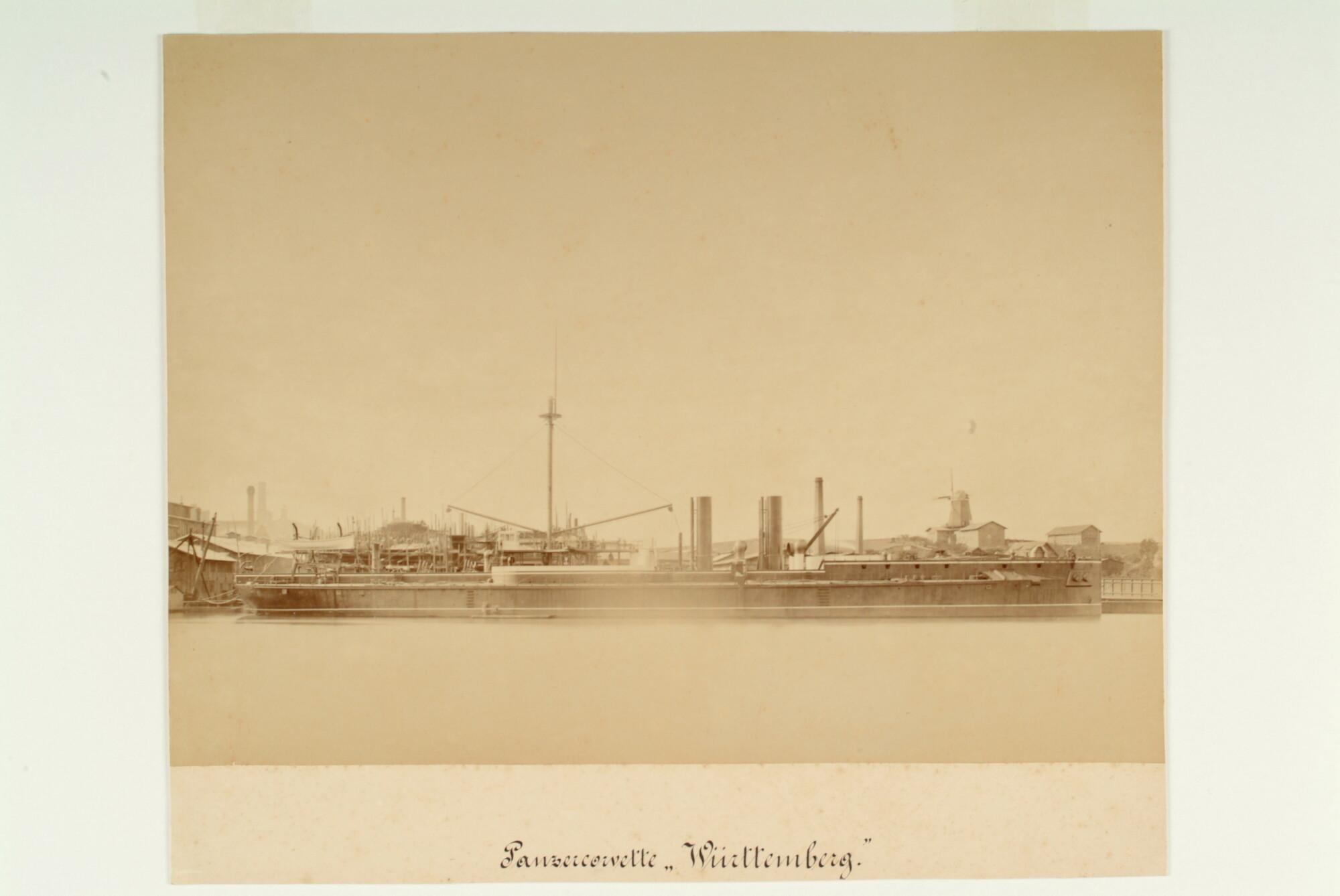 Het pantserkorvet "Würtemberg" afgemeerd aan de kade van Maatschappij Fijenoord te Schiedam.