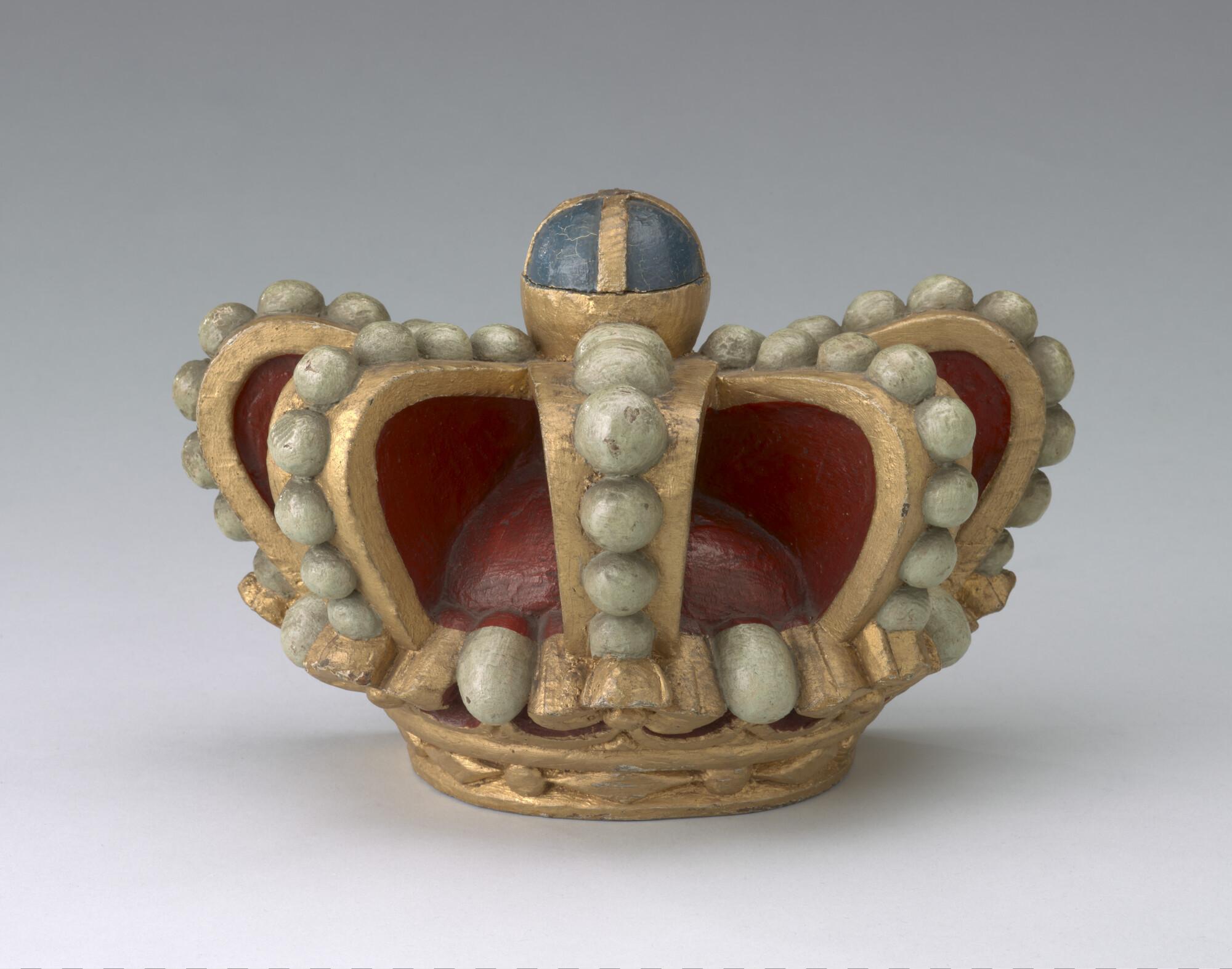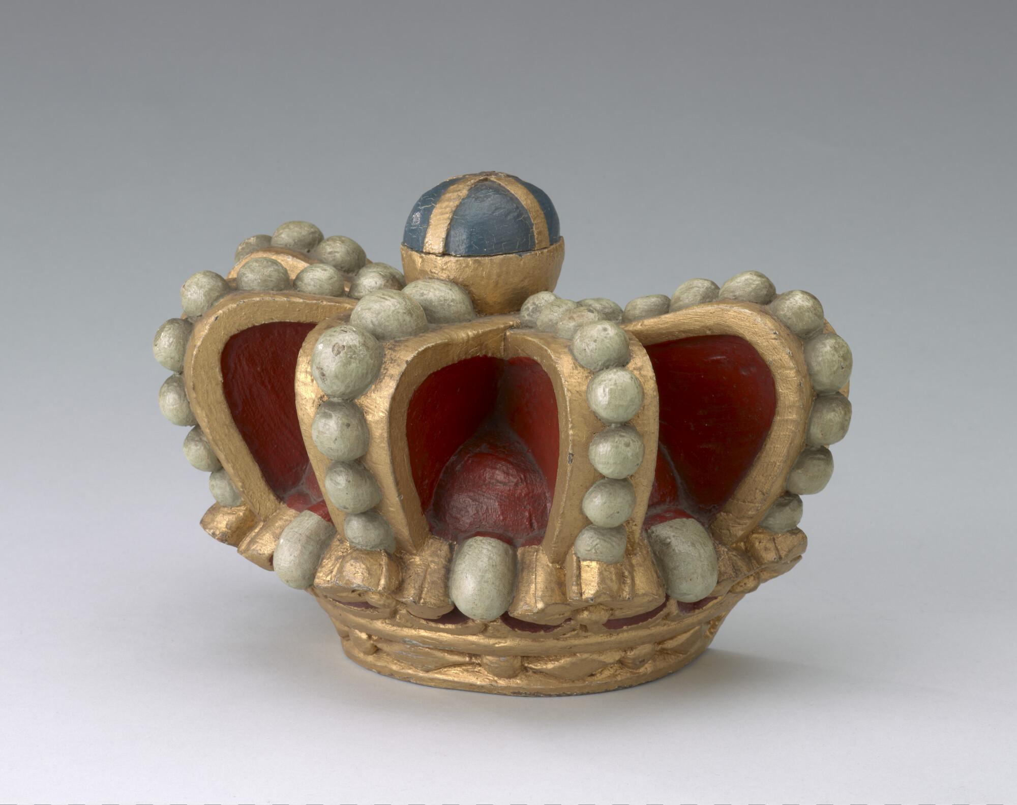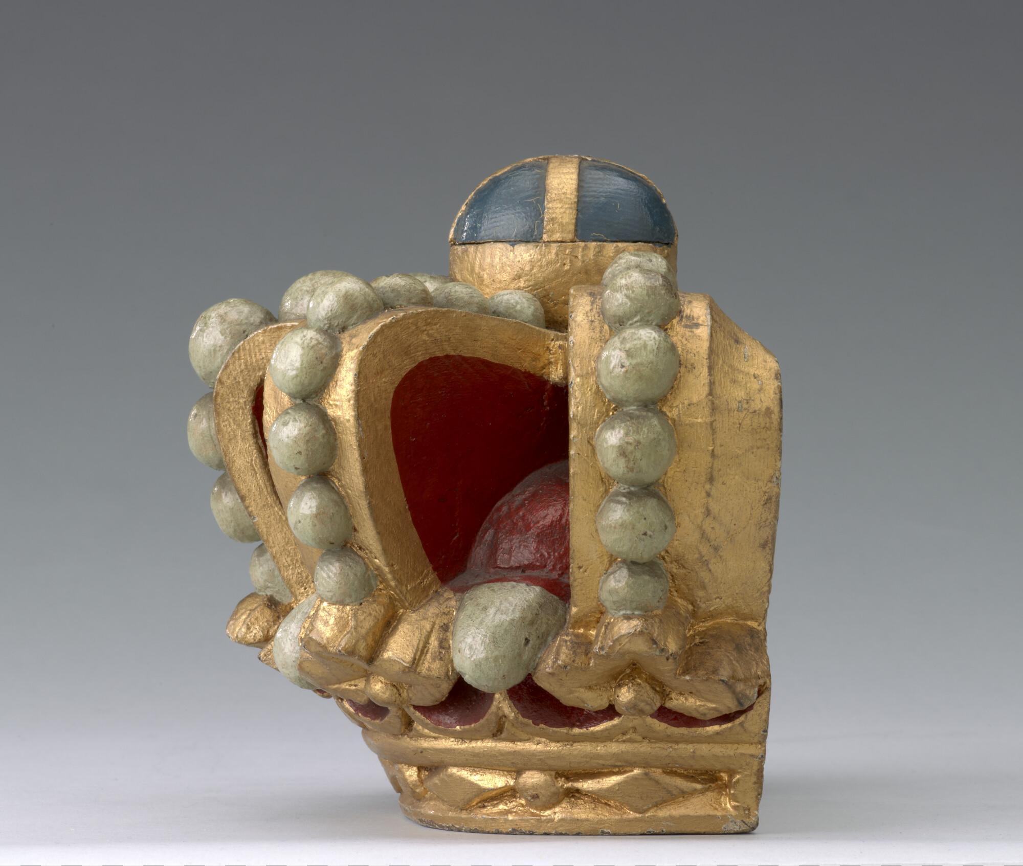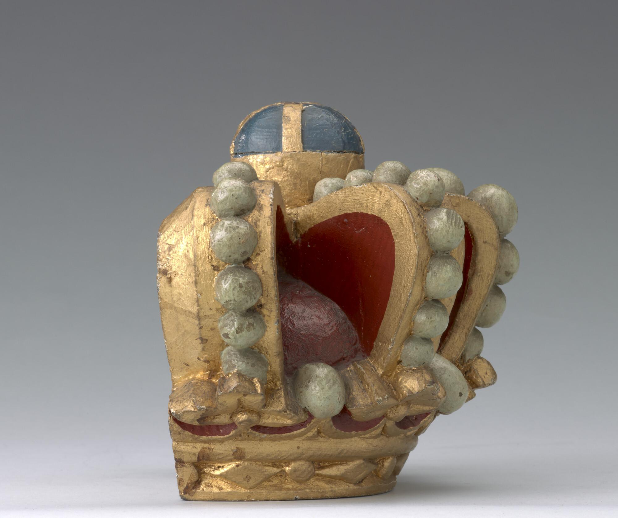Wapenkroon van 'Zr.Ms. "Kortenaer' met een verguld recht afgezaagde achterzijde. De halfronde onderkant is verguld en rood geschilderd.