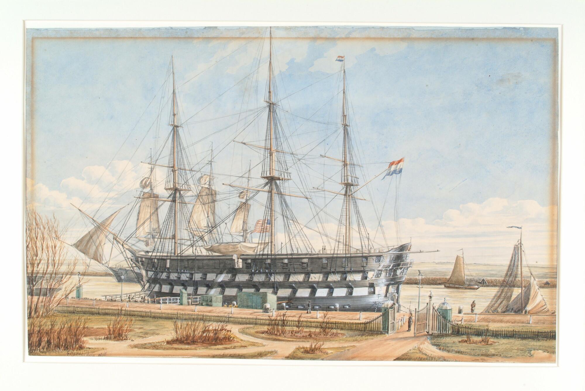 Het linieschip Zr.Ms. "Kortenaer" als wachtschip te Willemsoord daarachter een Amerikaans zeilschip.