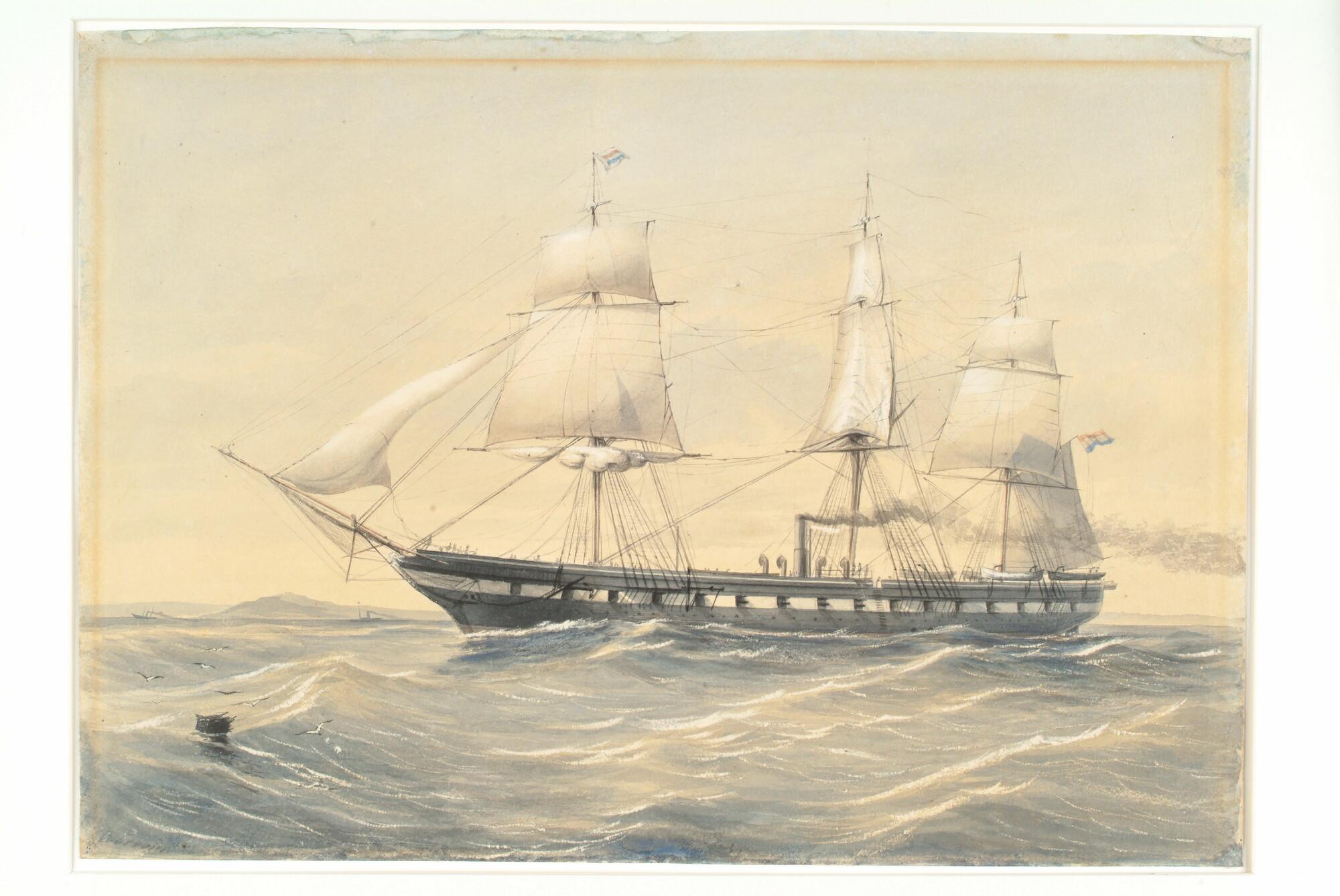 Het Zr.Ms. stoomtransportschip "Java" onder stoom en zeil.