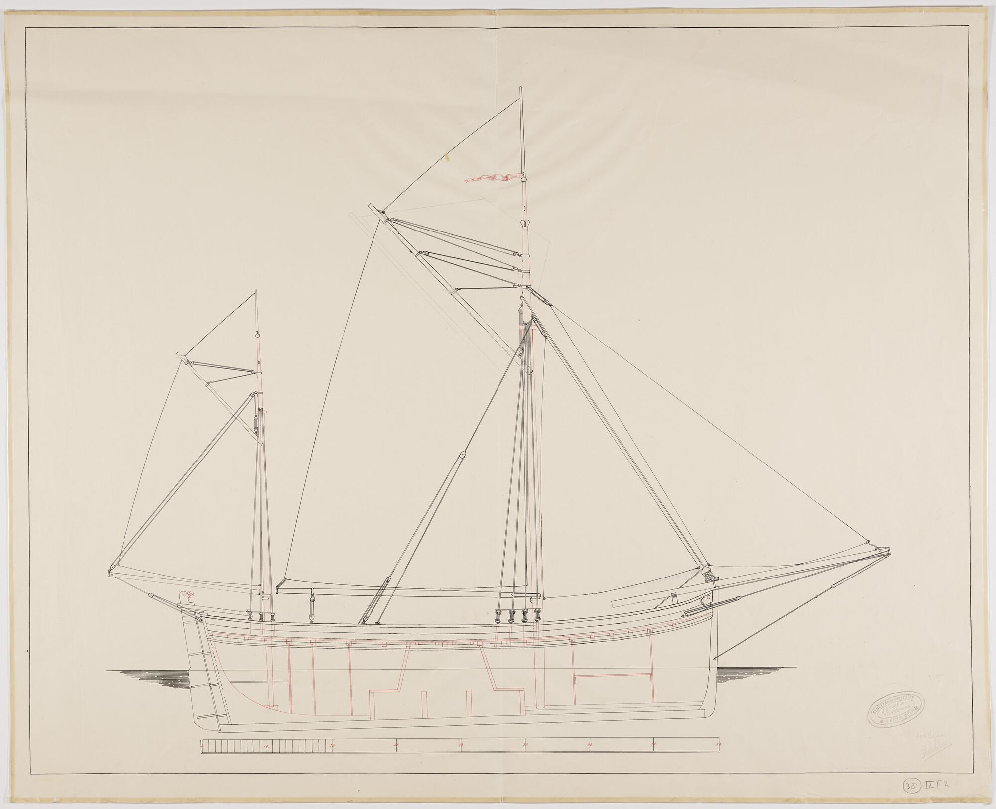 Zijaanzicht en Zeilplan van een vissloep, omstreeks 1880