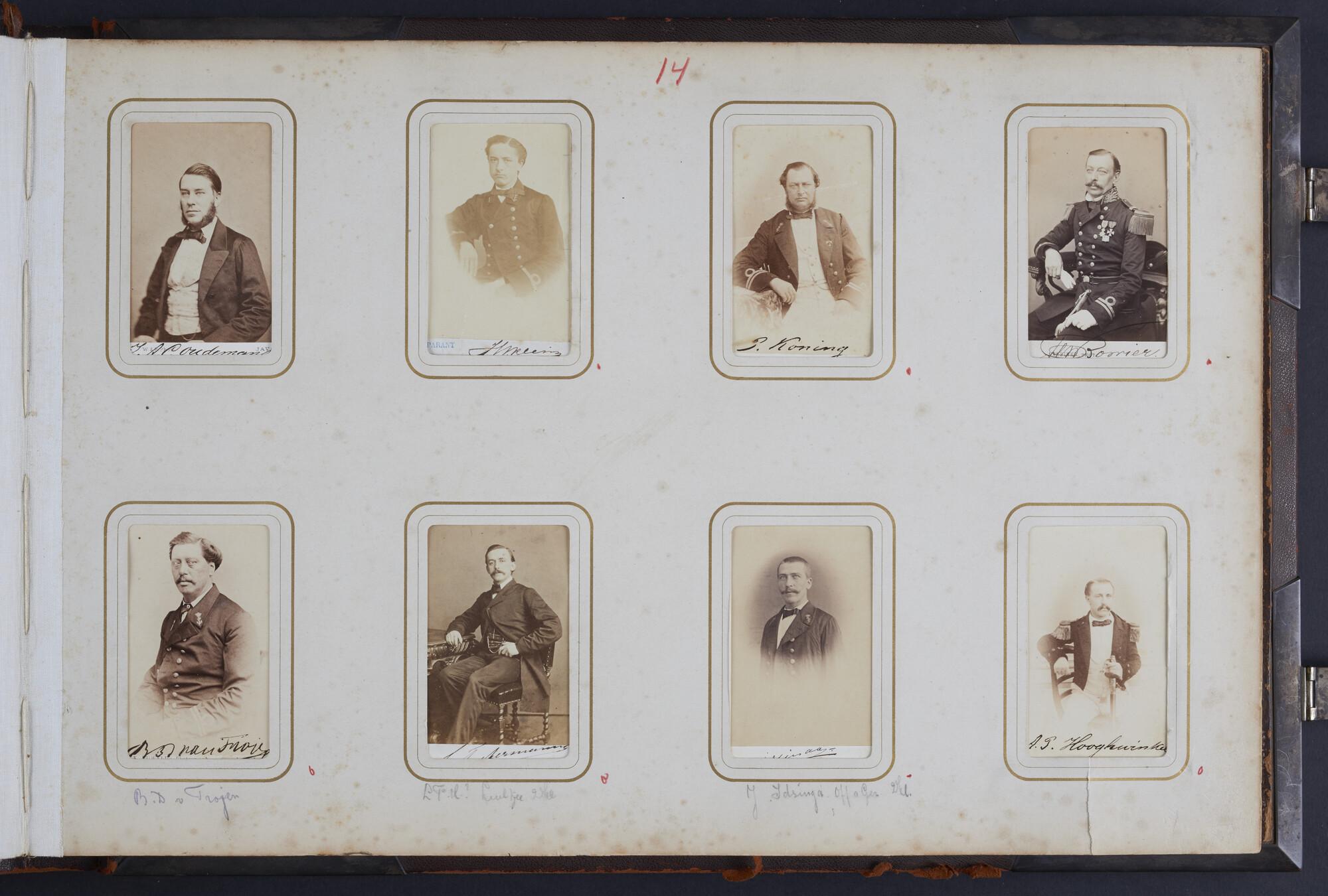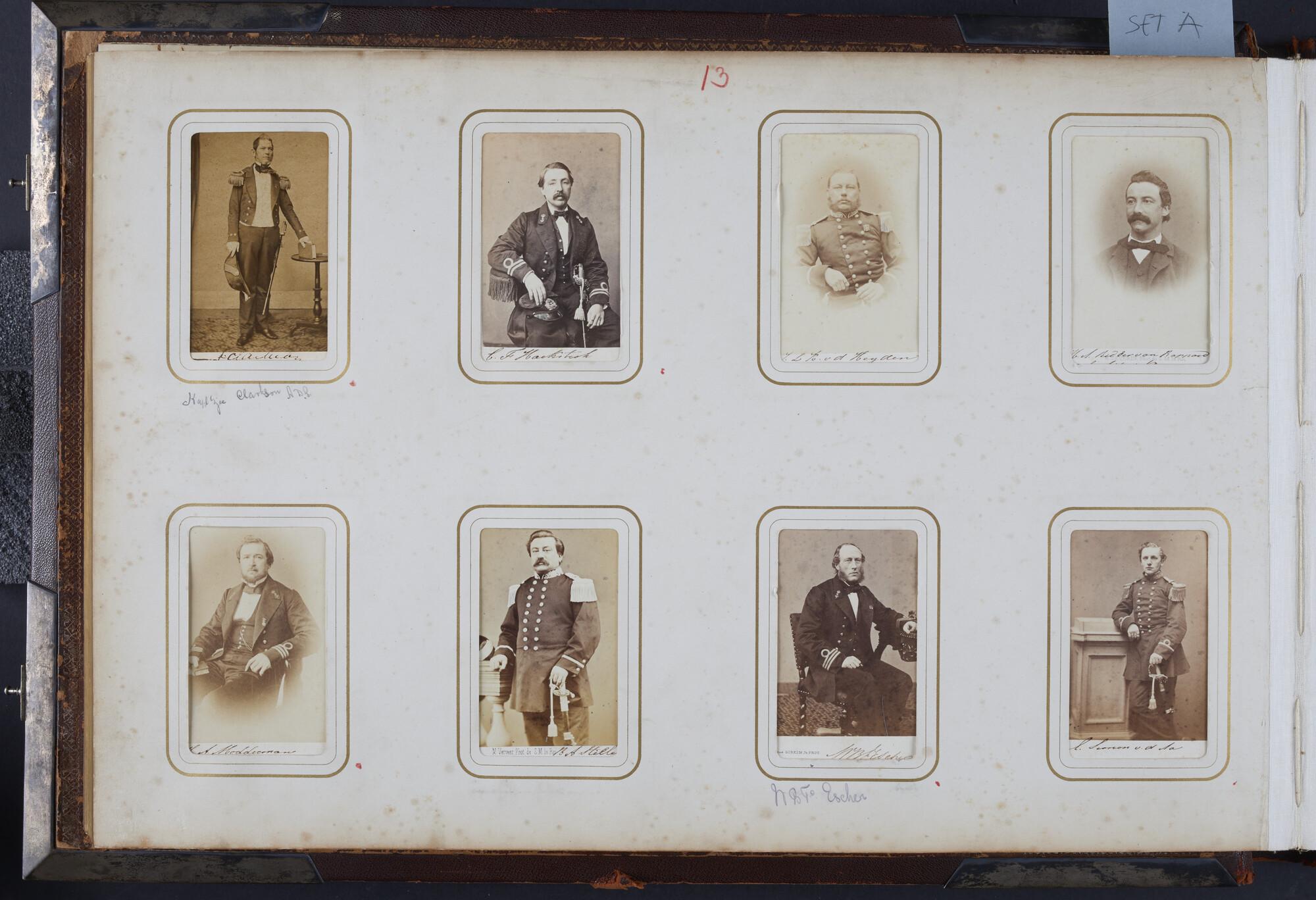 Album met houtsnedes op het voorplat, aangeboden aan vice-admiraal James May met portretfoto's van officieren en ambtenaren die in Nederlands-Indië onder hem dienden in de periode 1861 tot 1864.