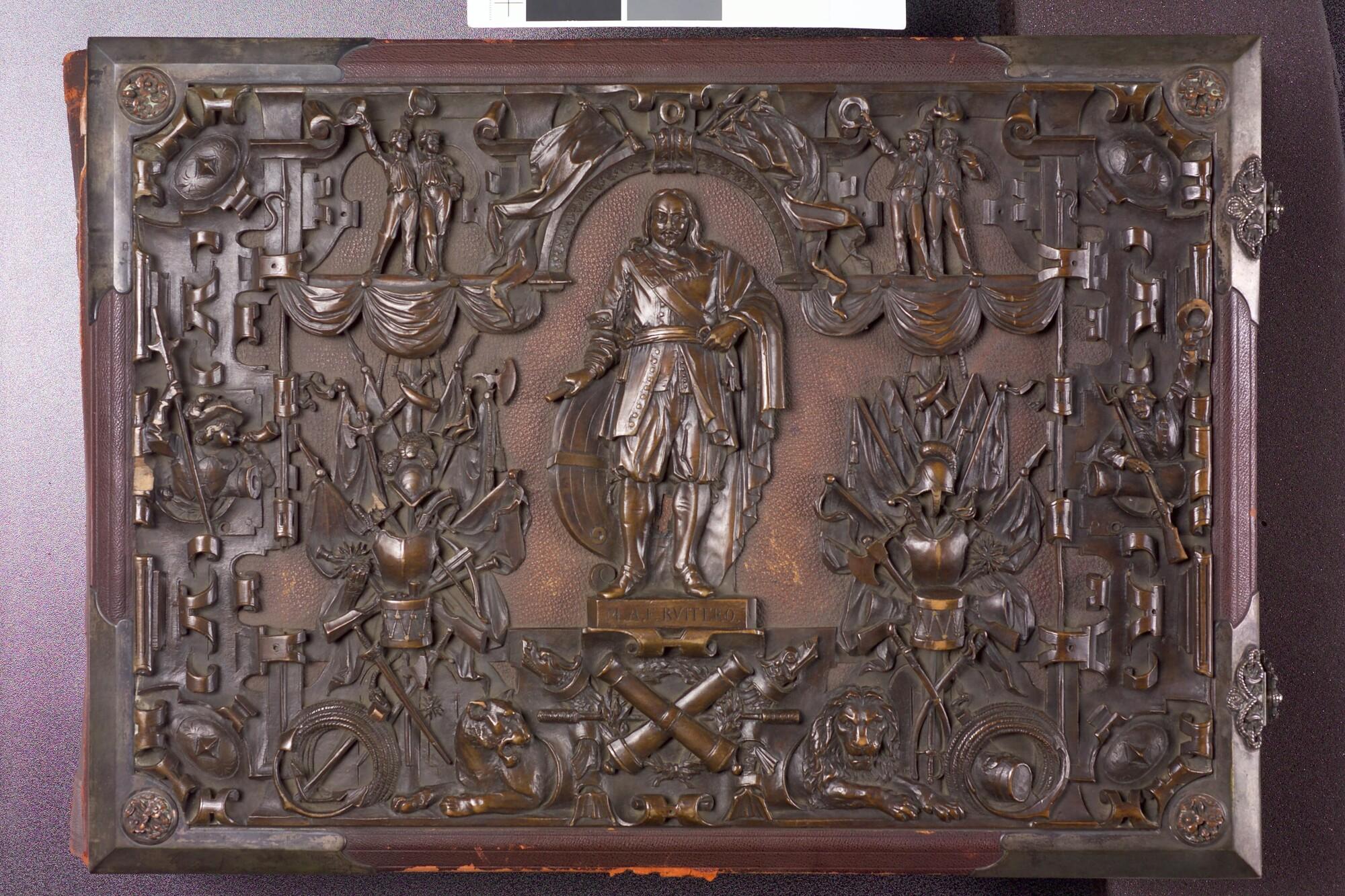 Album met houtsnedes op het voorplat, aangeboden aan vice-admiraal James May