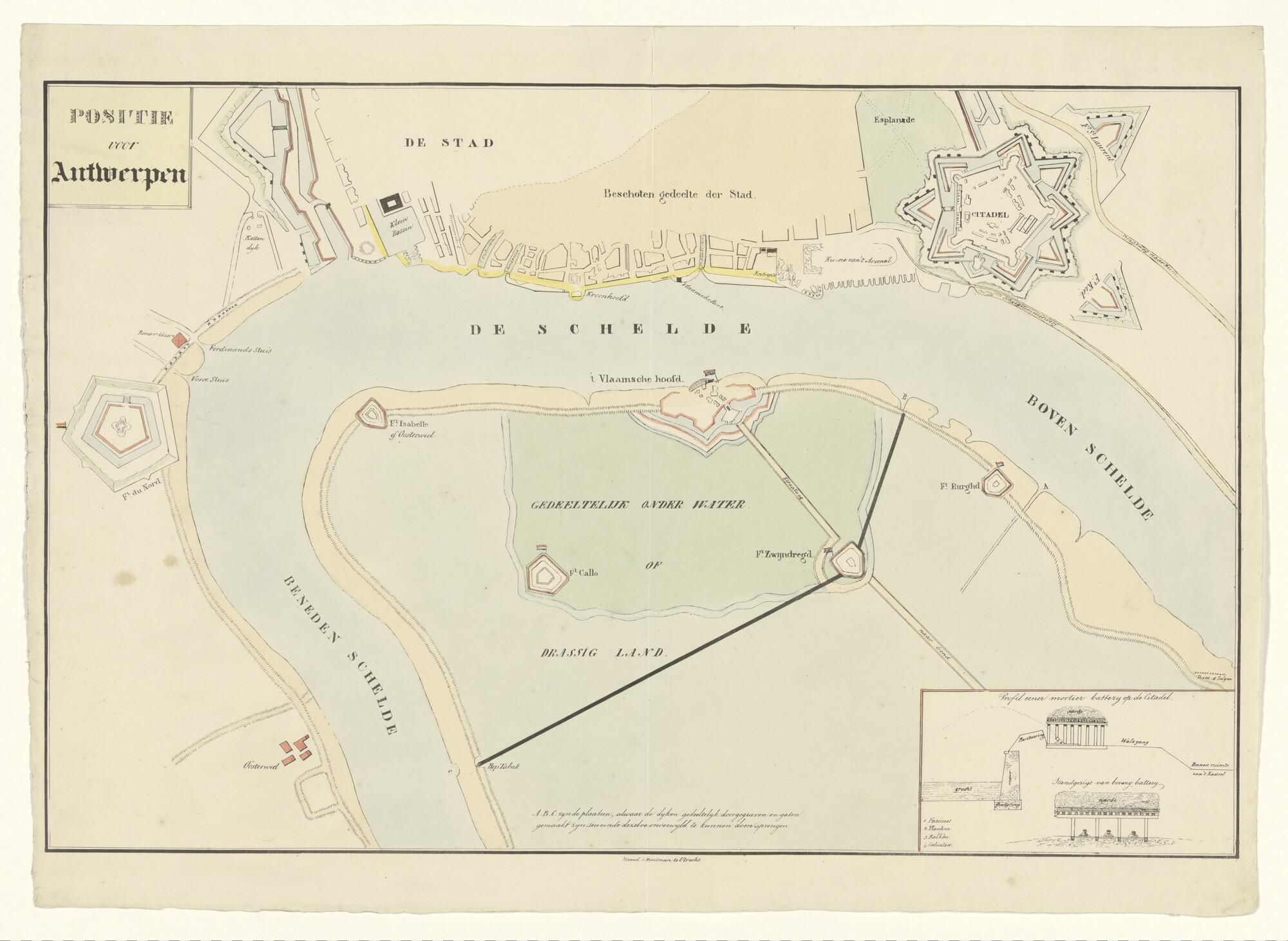Kaart, gekleurde litho, van de positie der verdedigingswerken voor Antwerpen. Druk Steendrukkerij Van Houtman, Utrecht, circa 1830.