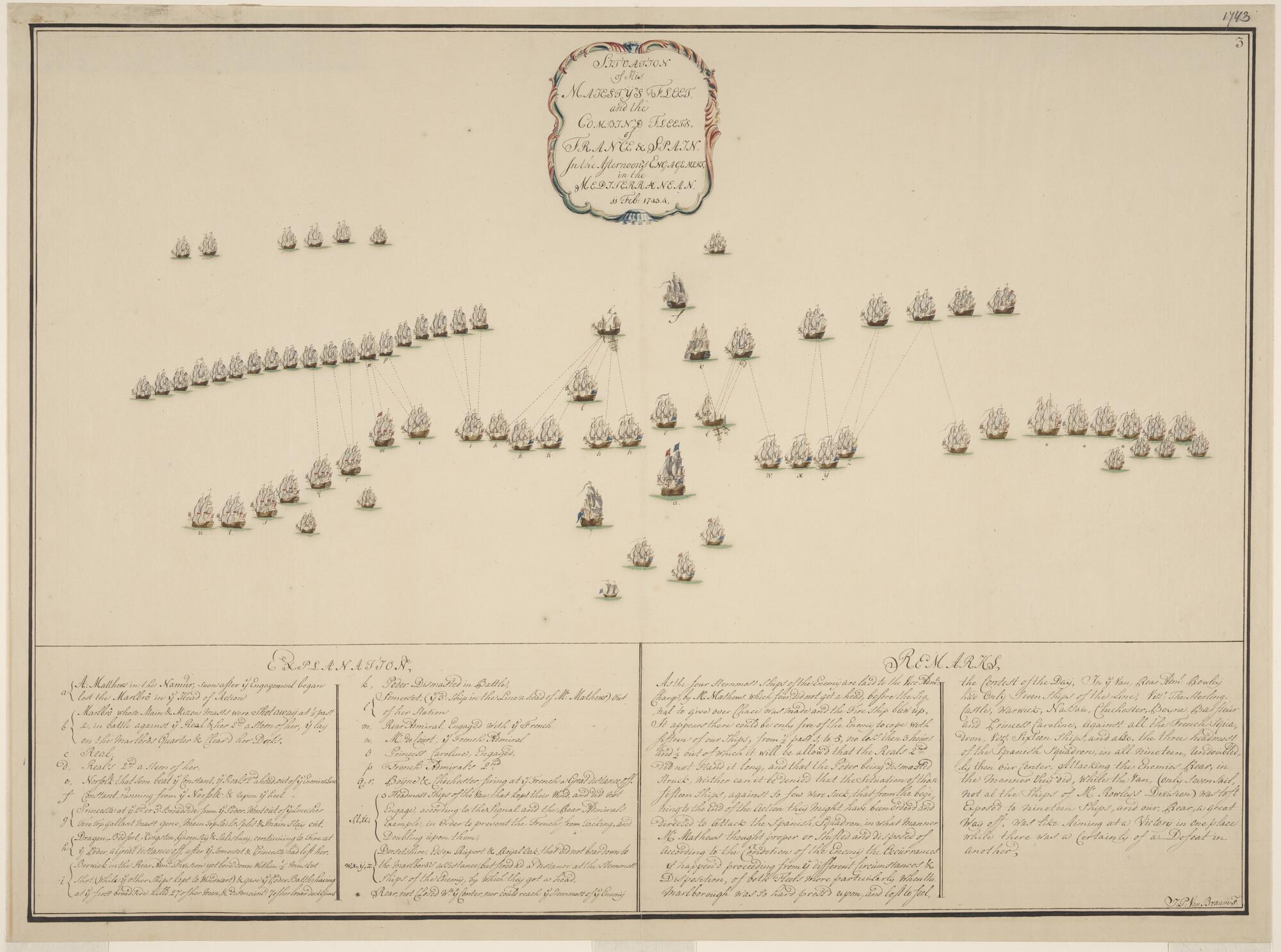 Tekening van de zeeslag tussen de Engelse vloot en de gecombineerde Franse en Spaanse vloten bij Toulon, 1744