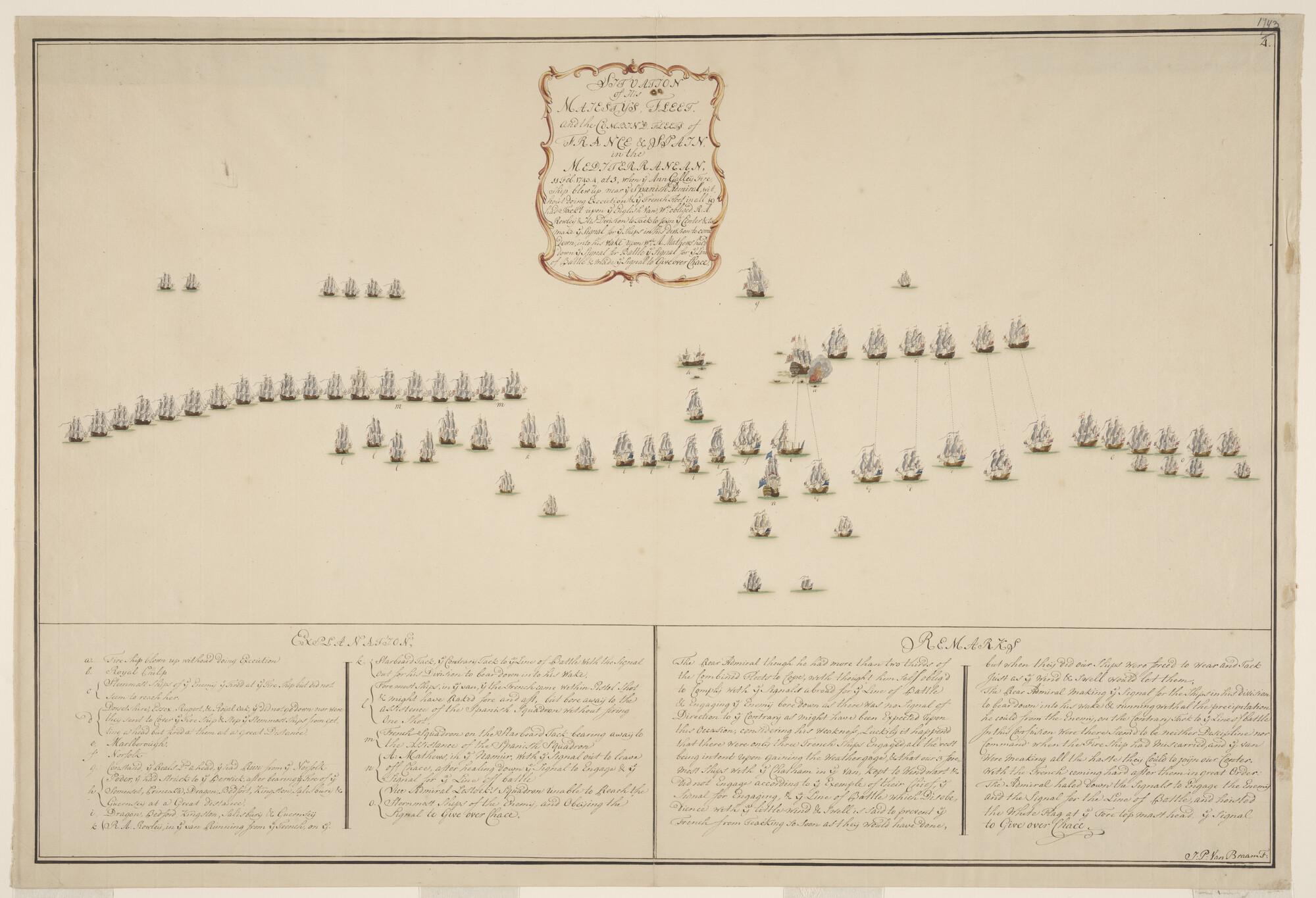 Tekening van de zeeslag tussen de Engelse vloot en de gecombineerde Franse en Spaanse vloten bij Toulon, 1744