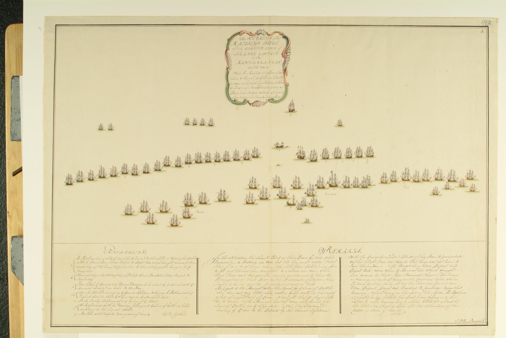 Situatietekening met uitgebreide legenda van de zeeslag bij Toulon oftewel de Slag bij Kaap Sicié (februari 1744), tussen de Engelse vloot en de gecombineerde Frans-Spaanse vloot. Kopie (de vijfde van een serie van zeven) gemaakt door J.P. van Braam van evenzovele prenten uit 1745 door Nathaniel Parr.