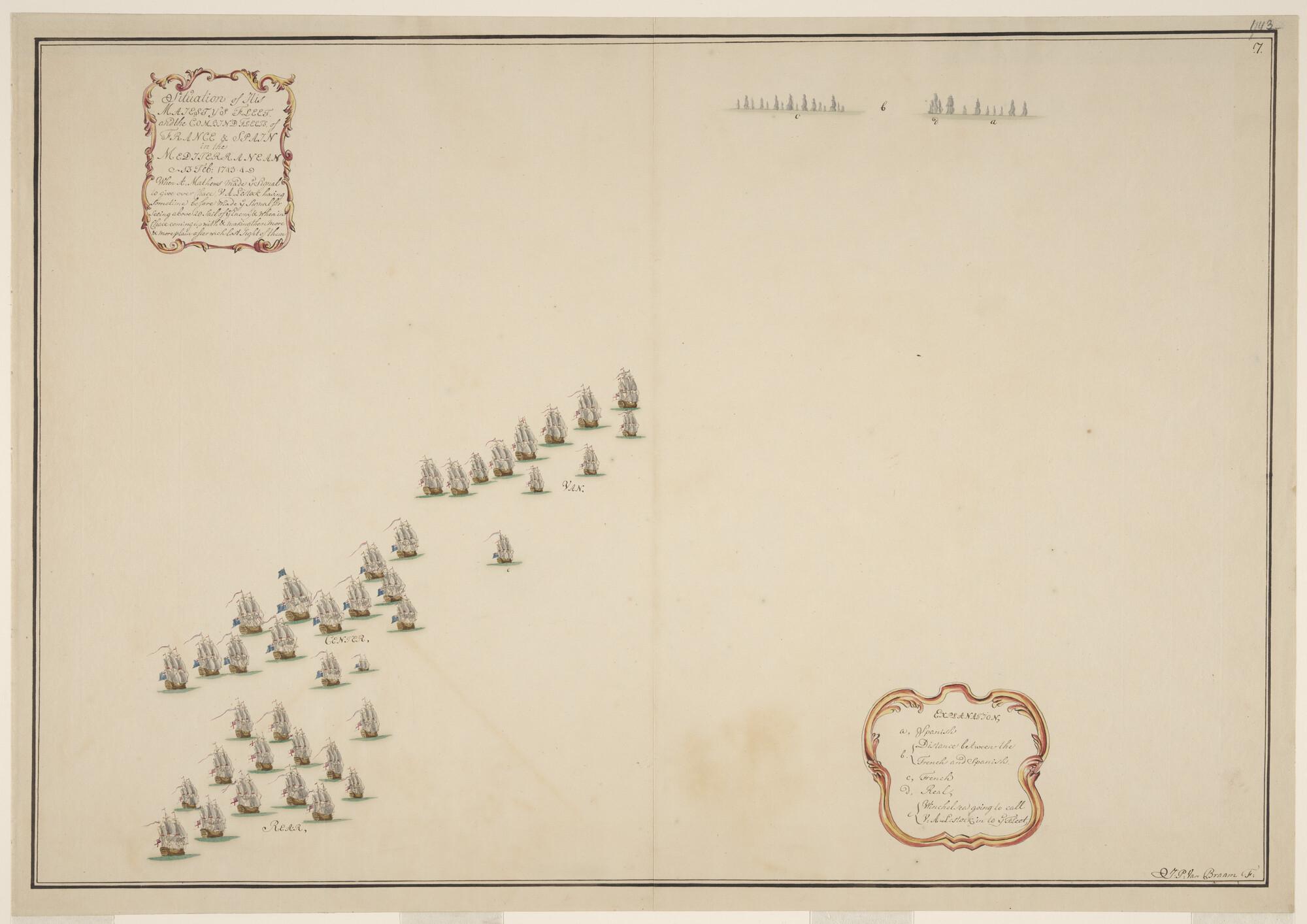Situatietekening met uitgebreide legenda van de zeeslag bij Toulon oftewel de Slag bij Kaap Sicié (februari 1744), tussen de Engelse vloot en de gecombineerde Frans-Spaanse vloot. Kopie (de zevende van een serie van zeven) gemaakt door J.P. van Braam van evenzovele prenten uit 1745 door Nathaniel Parr.