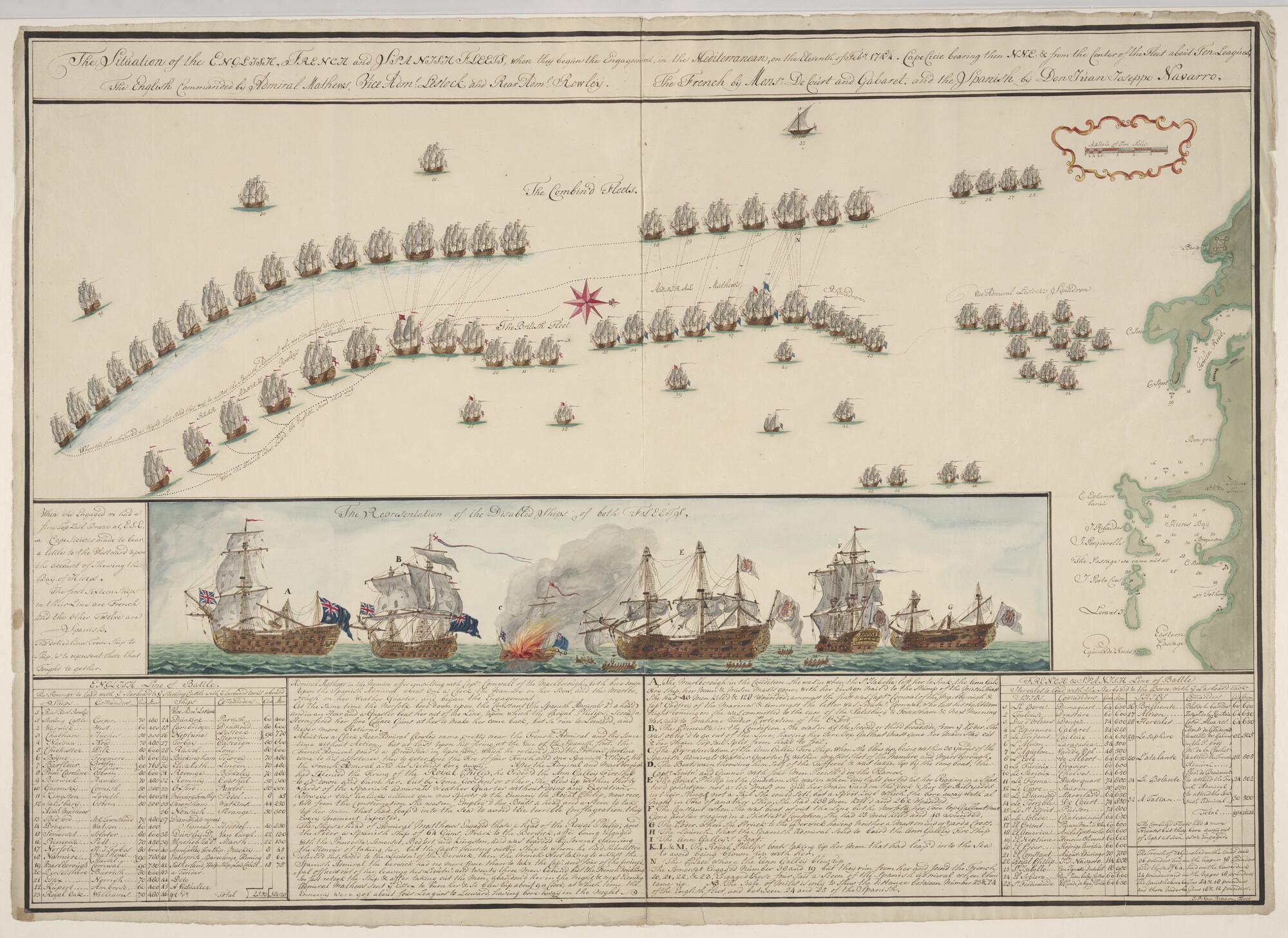 Tekening van de zeeslag tussen de Engelse vloot en de gecombineerde Franse en Spaanse vloten bij Toulon, 1744