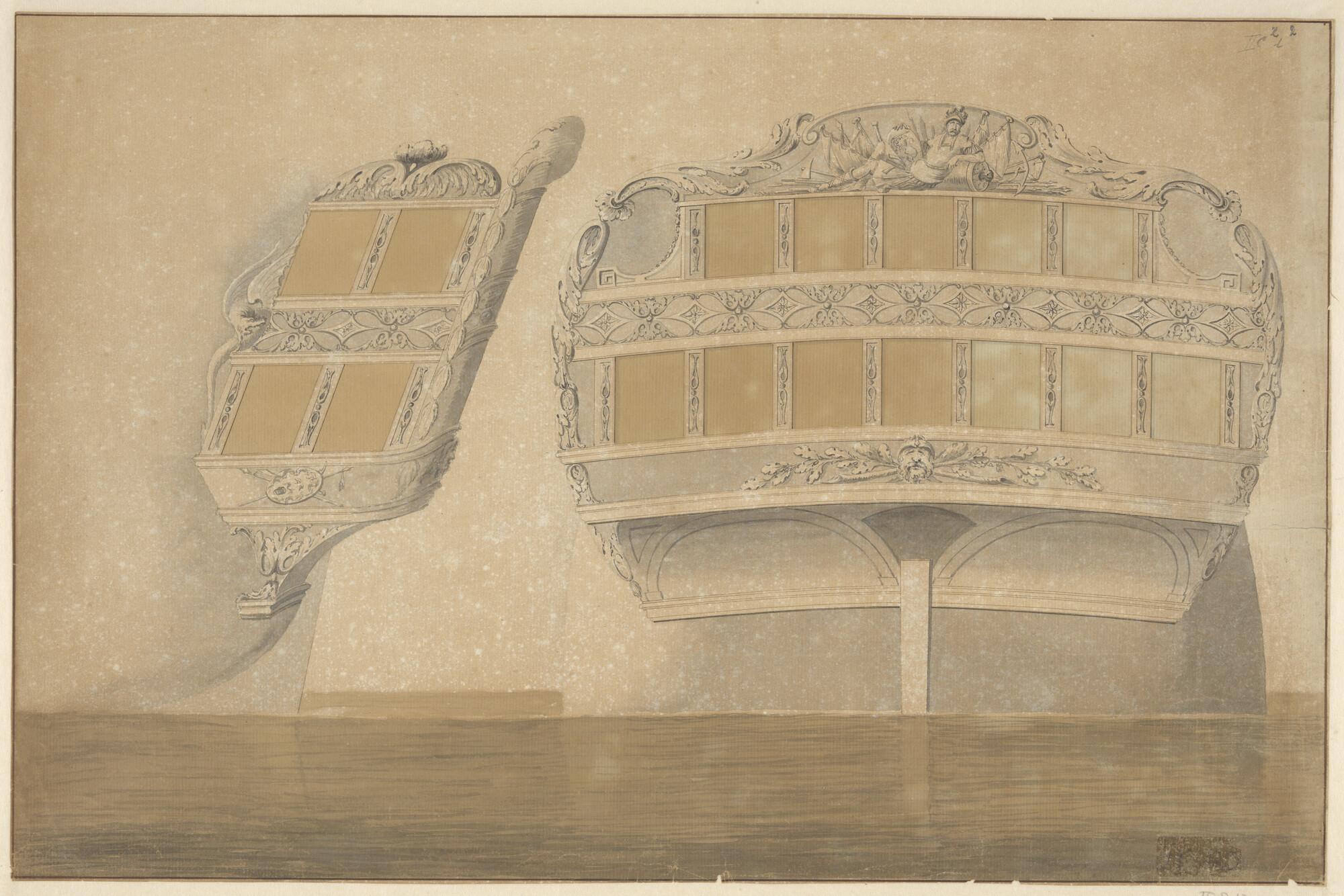 Spiegel met twee rijen ramen waartussen een band met afwisselend gevulde ruiten en spiegelbeeld bladmotieven. Zijgalerij met zelfde tussenband.