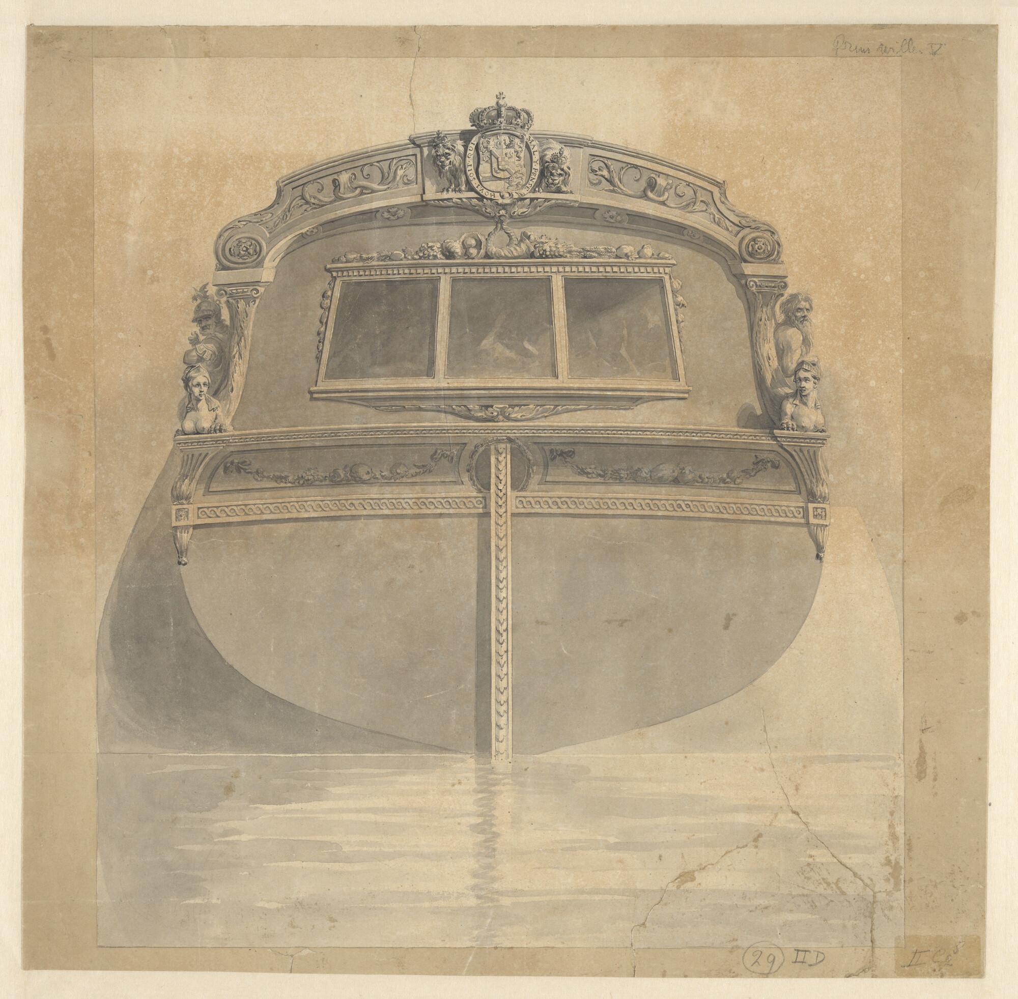 Spiegelversiering met drie ramen met in bovenrand het wapen van Prins Willem verticalen.