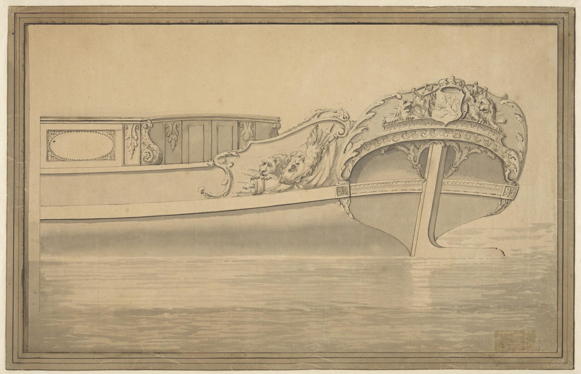 Aanzicht bakboord achter van een trekjacht. Op de spiegel het generaliteitswapen.