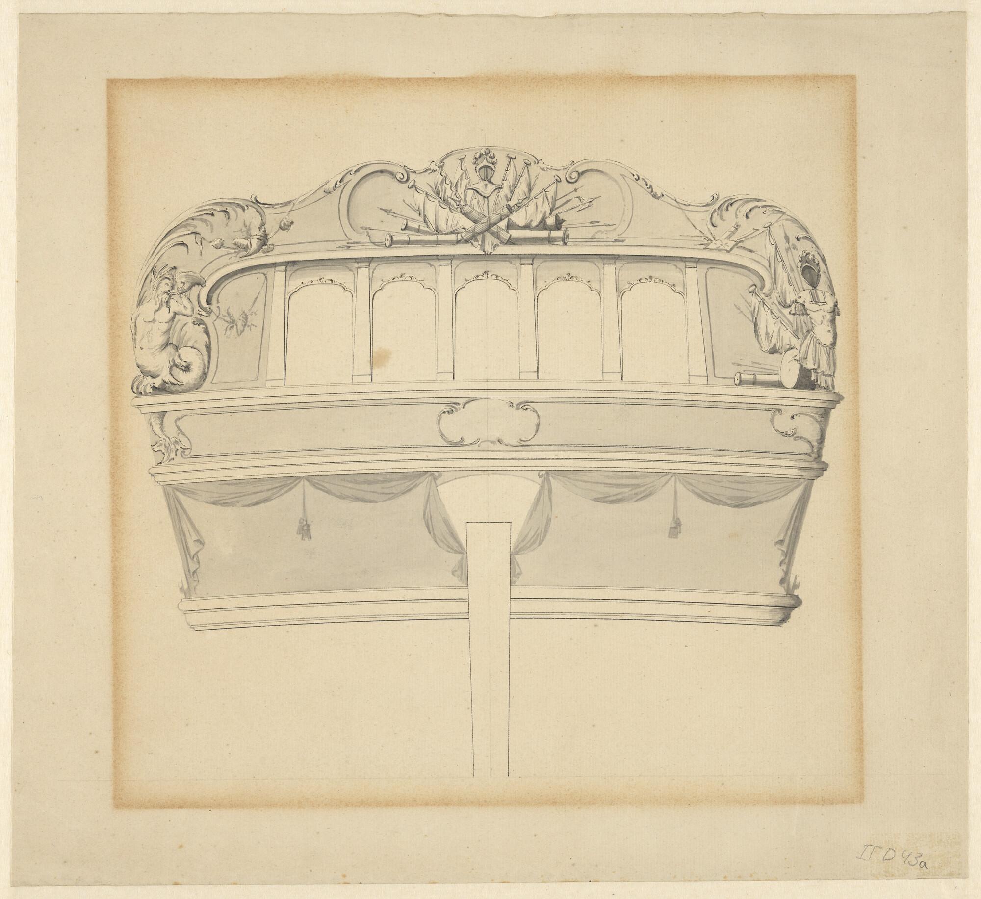 Spiegel met 5 ramen, waarboven een waaier van vlaggen, kanons, pijlenbundels en pieken, gekroond door gepluimde helm. Scheg met klimmende leeuw, vaandels, helm, schild, lint waarop 'Vigilate deo confidentes'.