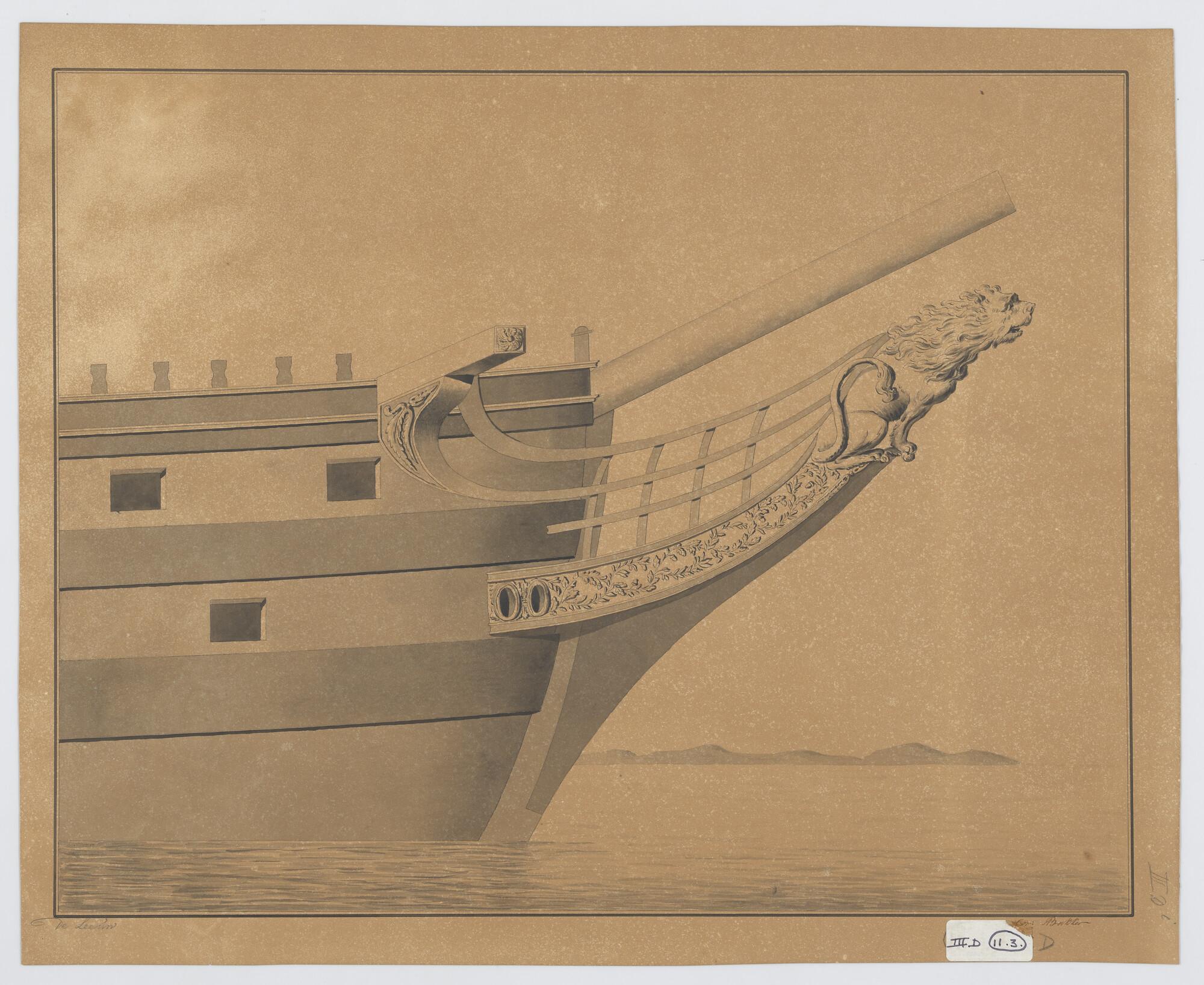 Ontwerp van het schegbeeld van het linieschip 'Leeuw' met een zittende voor zich uitstarende leeuw.