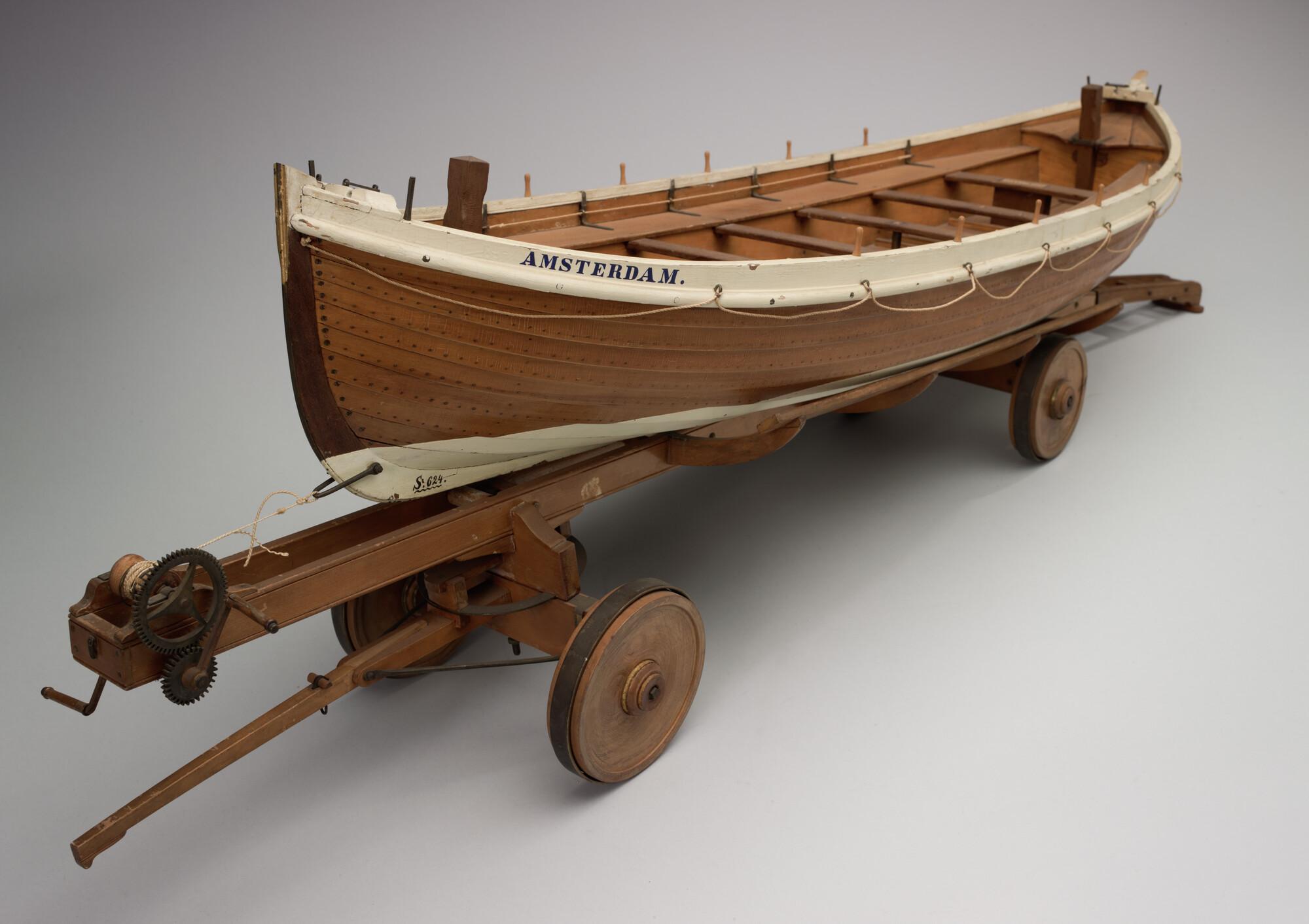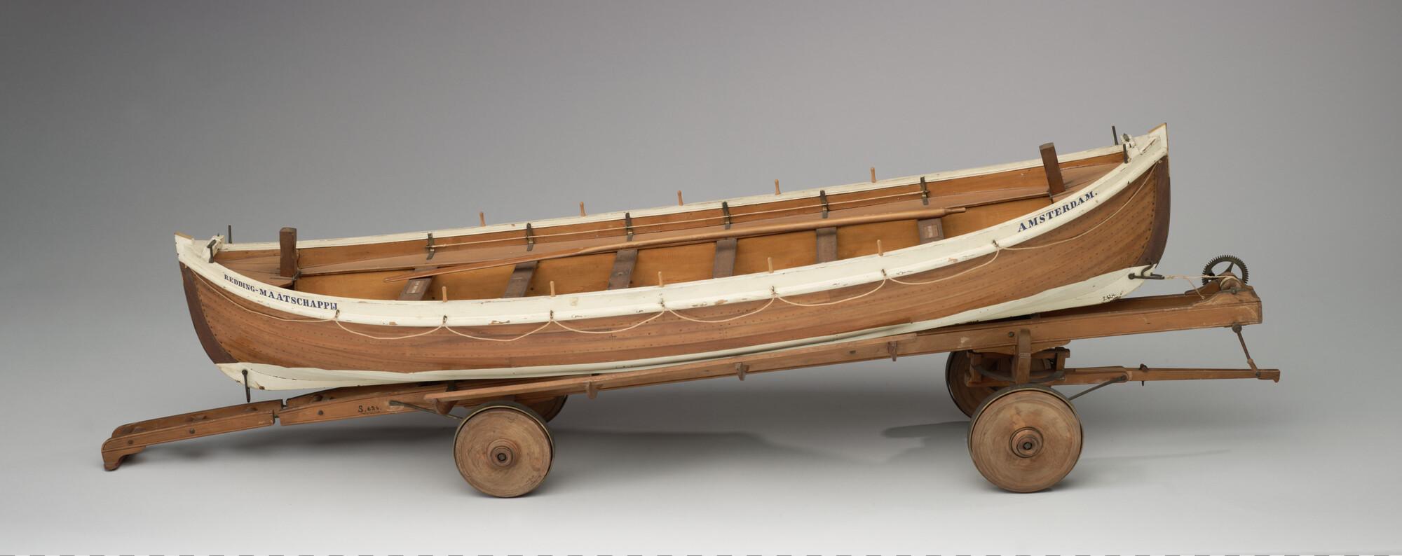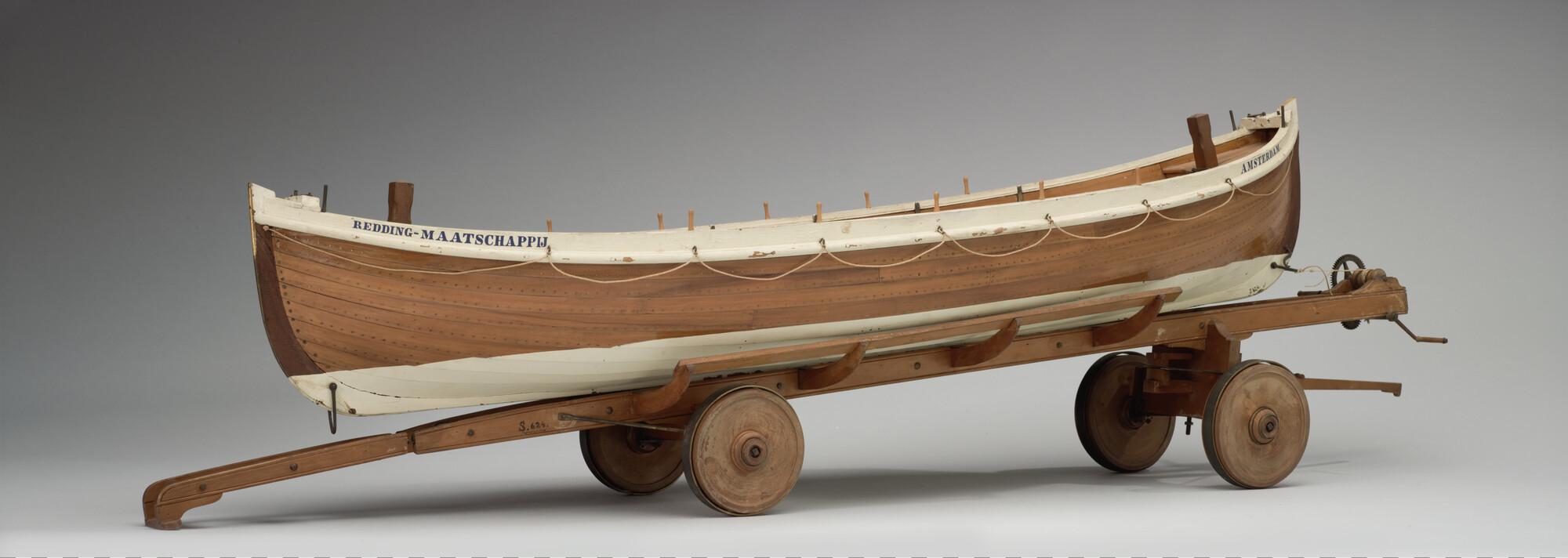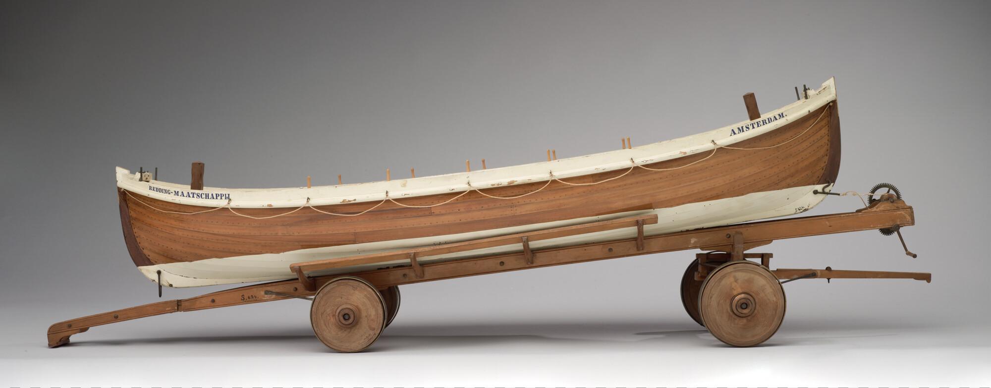 Demonstratiemodel (schaal 1:8) van een strandreddingboot op wagen. Dit model werd in 1880 gemaakt op de werf van M. Bruyne & Zoon te Amsterdam, bouwers van reddingboten voor de N&ZHRM. De boot heeft luchtkasten langs de boorden en onder de buikdenning.