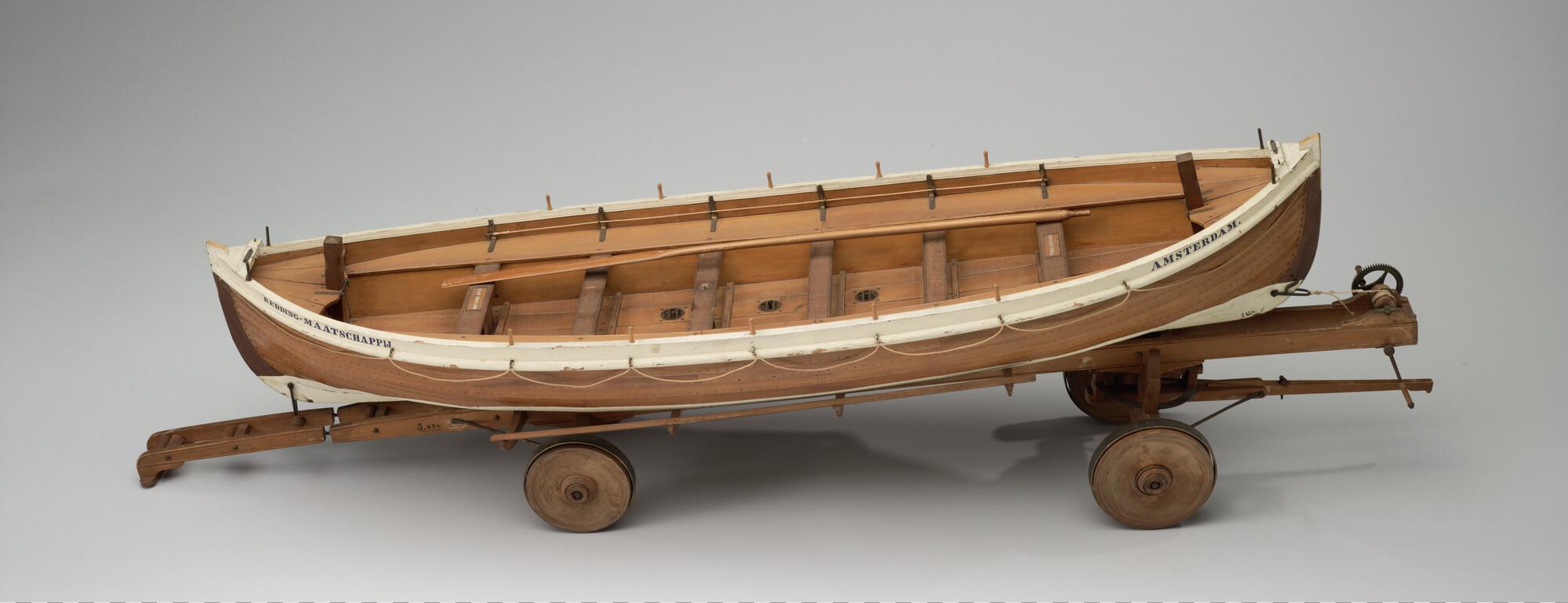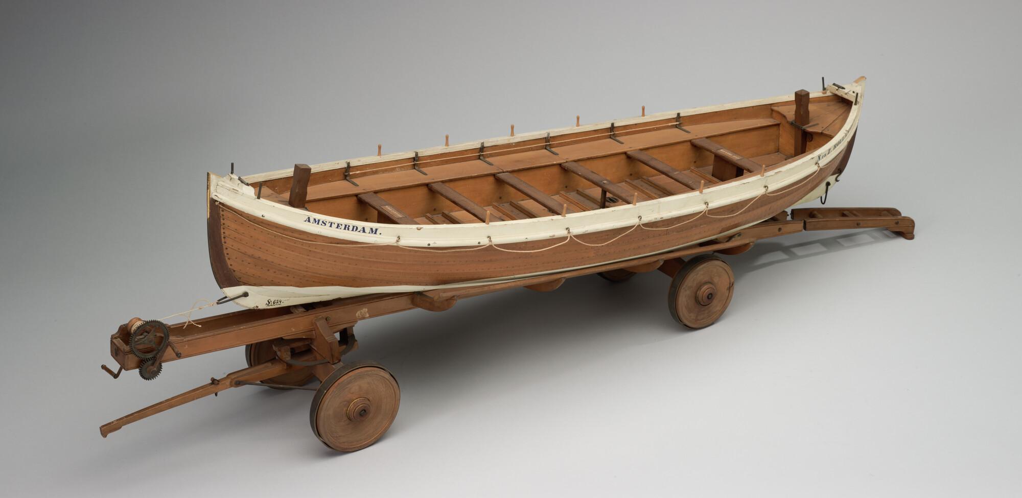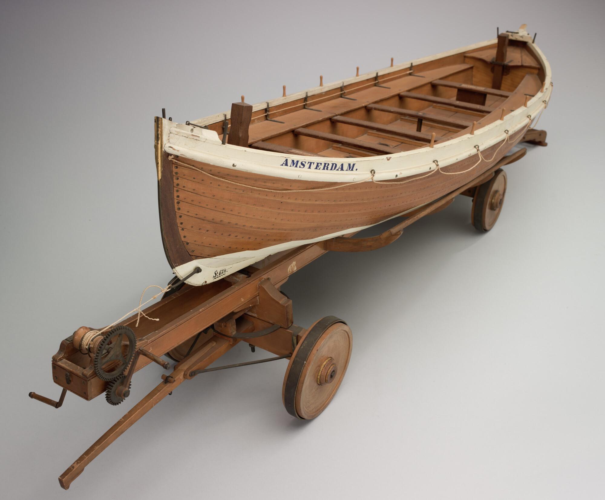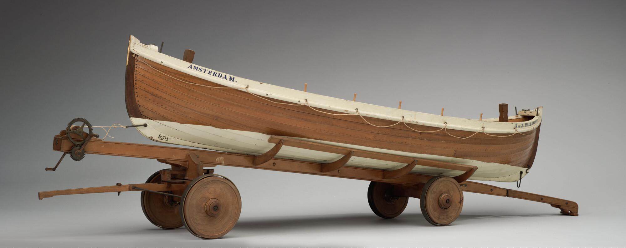 Demonstratiemodel (schaal 1:8) van een strandreddingboot op wagen. Dit model werd in 1880 gemaakt op de werf van M. Bruyne & Zoon te Amsterdam, bouwers van reddingboten voor de N&ZHRM. De boot heeft luchtkasten langs de boorden en onder de buikdenning.
