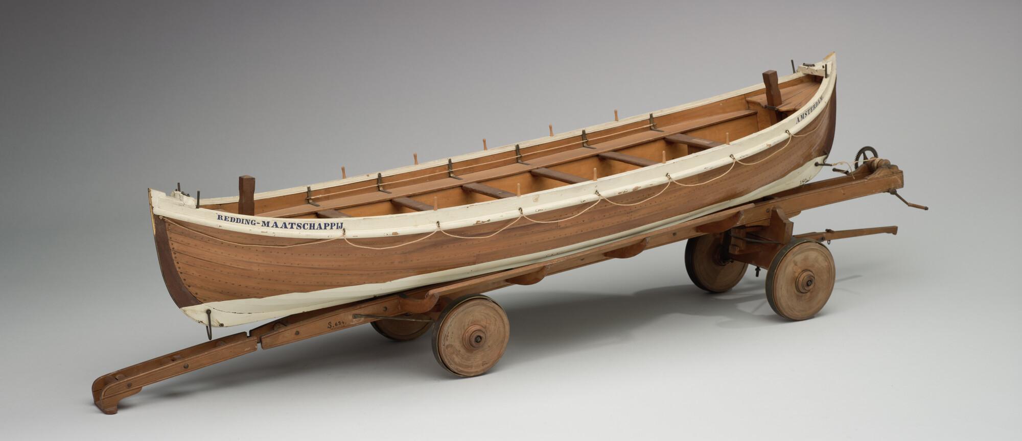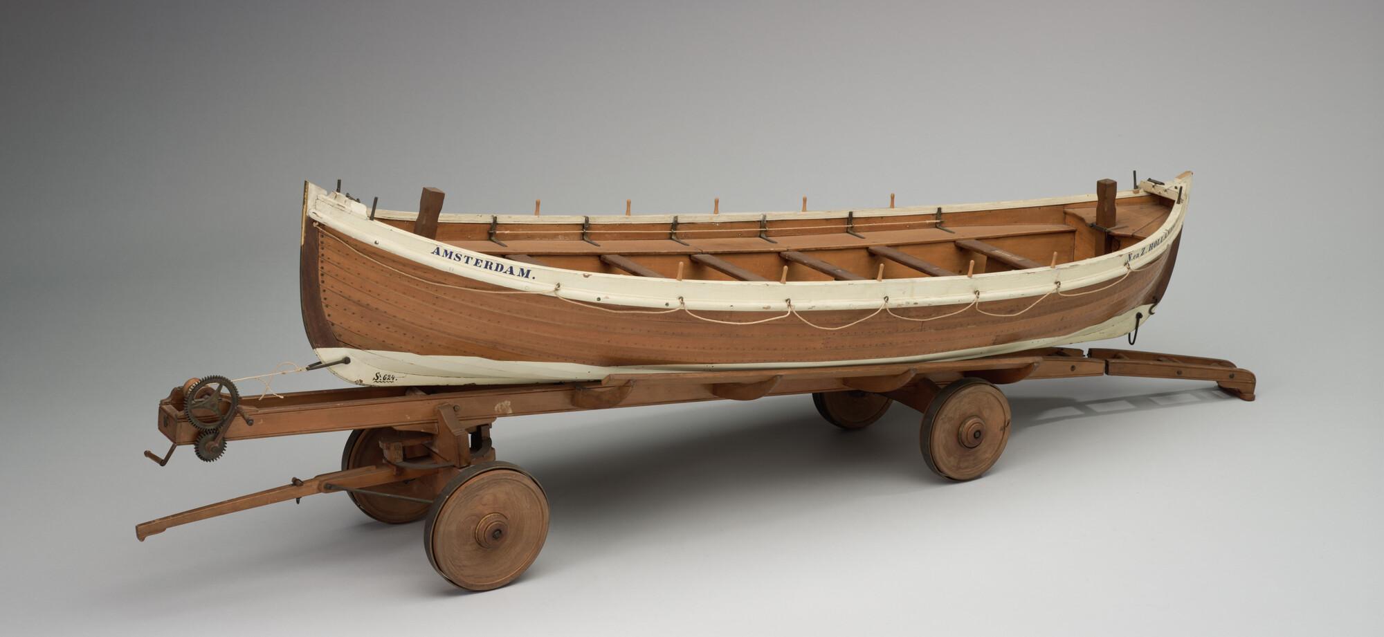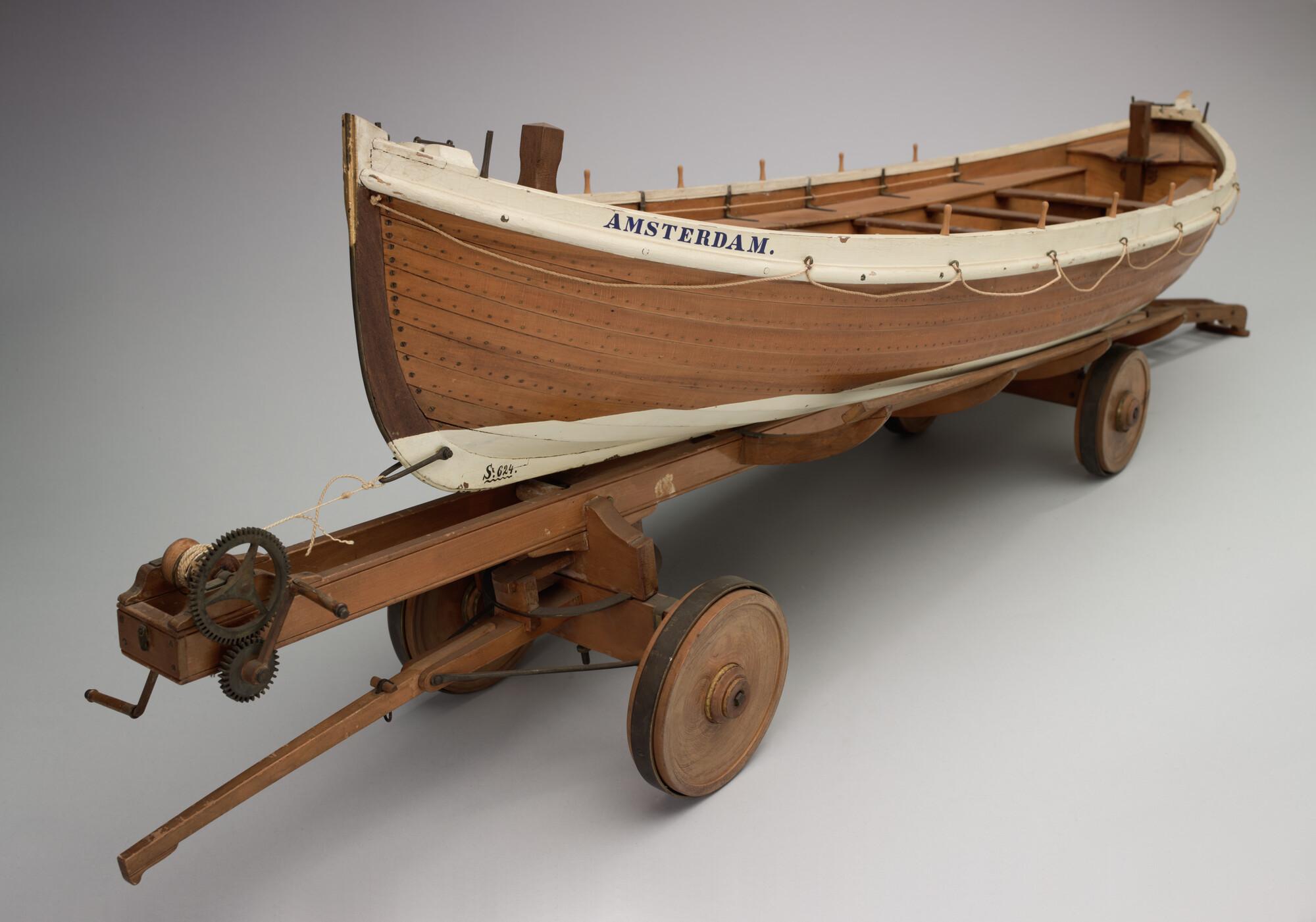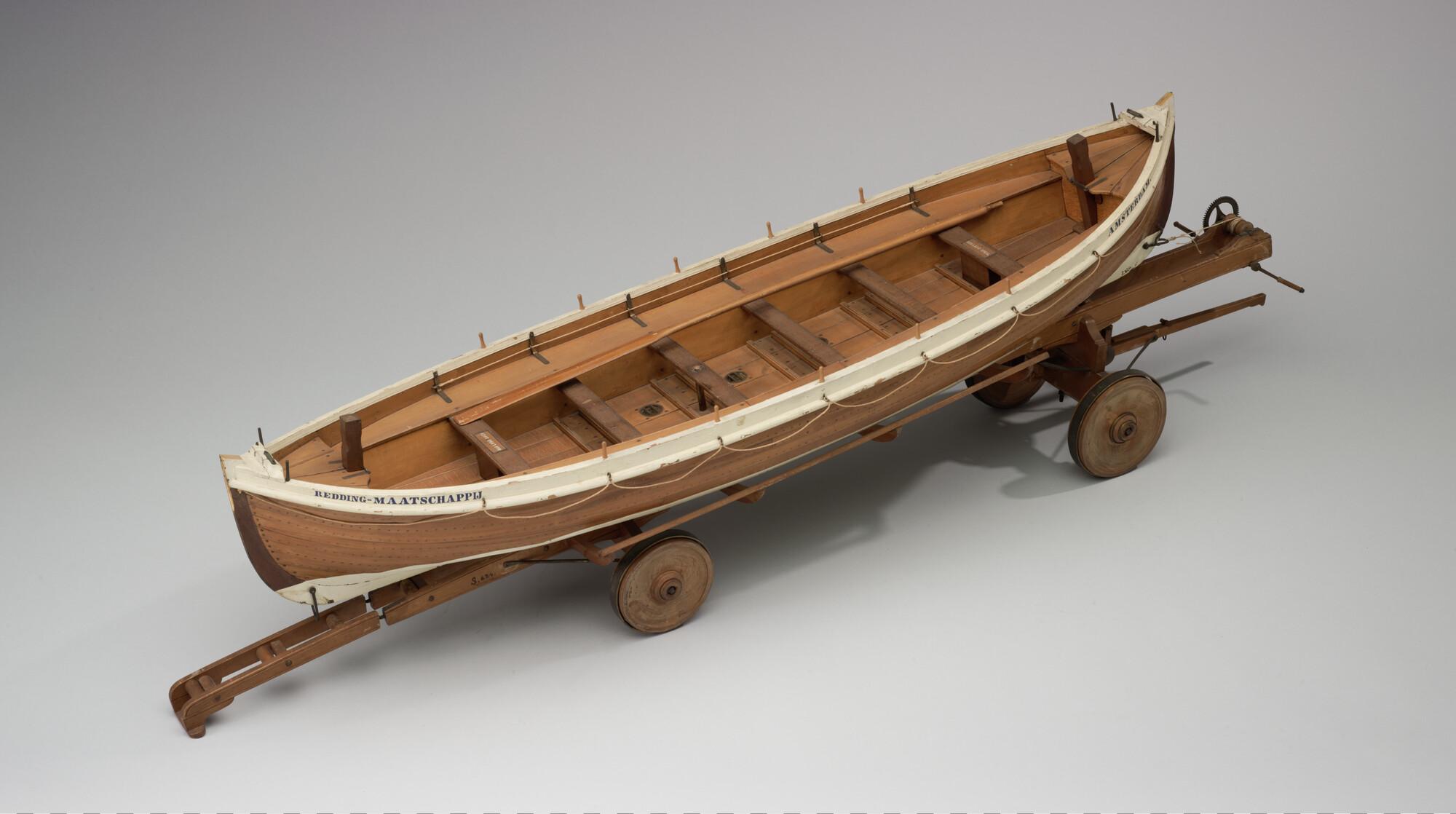 Demonstratiemodel (schaal 1:8) van een strandreddingboot op wagen. Dit model werd in 1880 gemaakt op de werf van M. Bruyne & Zoon te Amsterdam, bouwers van reddingboten voor de N&ZHRM. De boot heeft luchtkasten langs de boorden en onder de buikdenning.