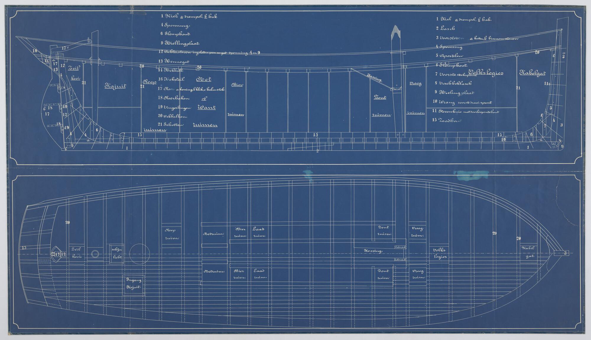 Blauwdruk betrekking hebbend op de bouw van houten visloggers, einde negentiende eeuw. Verticale langsdoorsnede en bovenaanzicht.