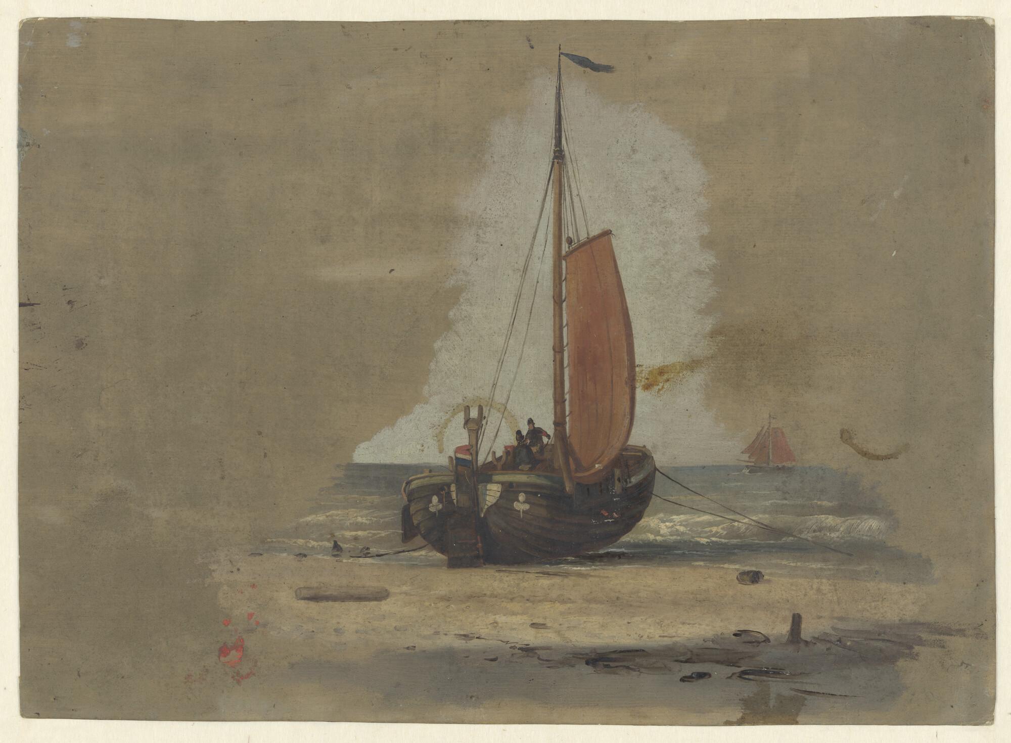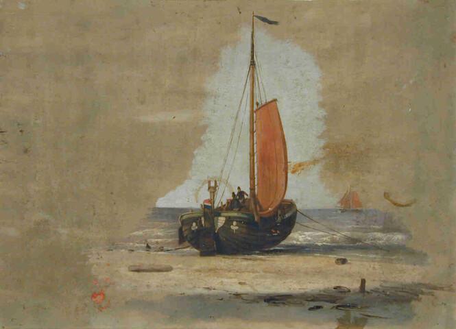 Olieverftekening van een visserspink (bomschip) op het strand.