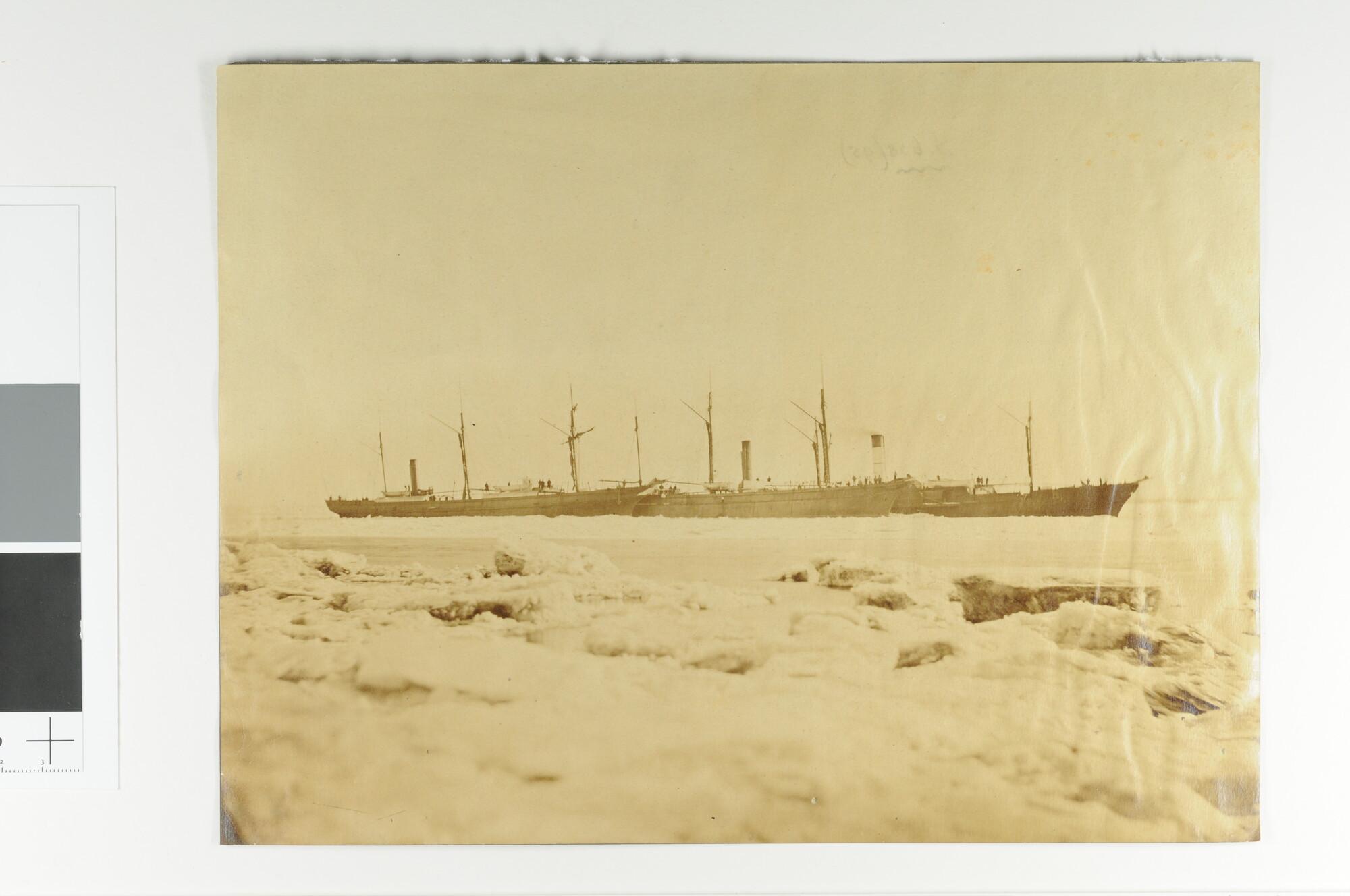 Twee stoom-passagiersschepen en een raderstoomschip zitten vast in het ijs 'Ingevroren op de Zuiderzee'.
