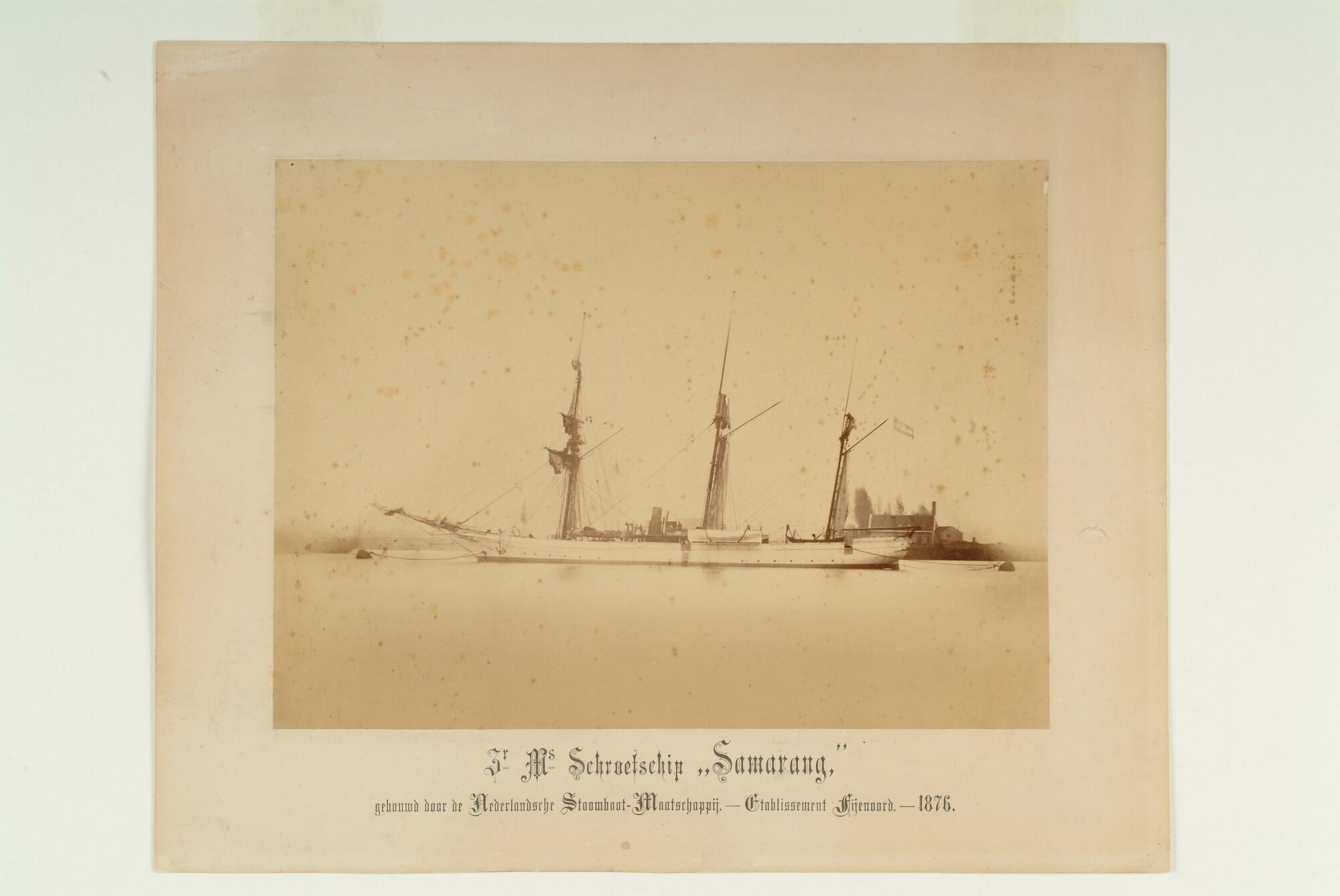 Het schroefstoomschip 4de klasse Zr.Ms. "Samarang" voor anker liggende. Gebouwd in 1876 bij de Nederlandsche Stoomboot Maatschappij, etablissement Feijenoord.