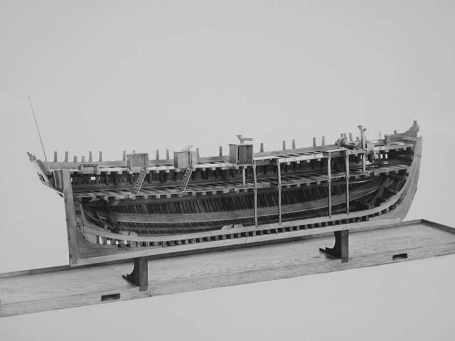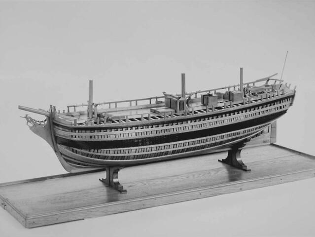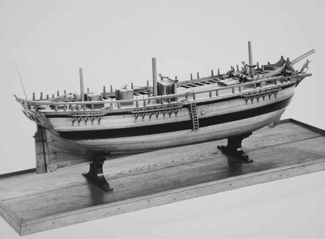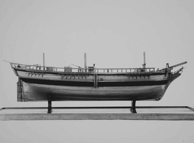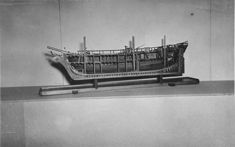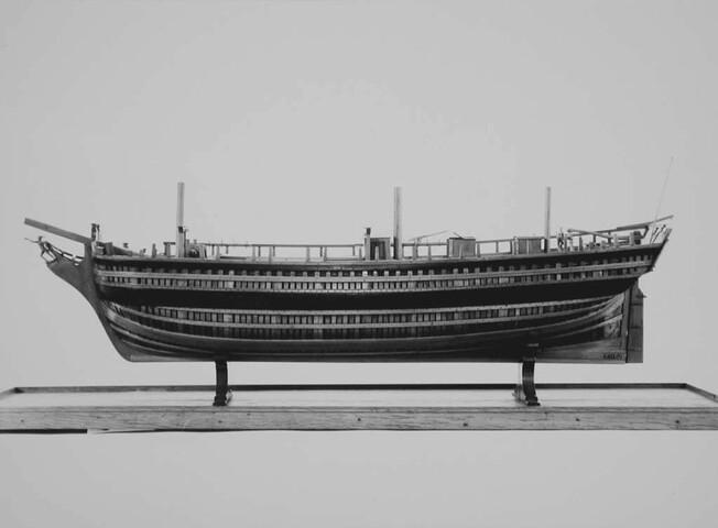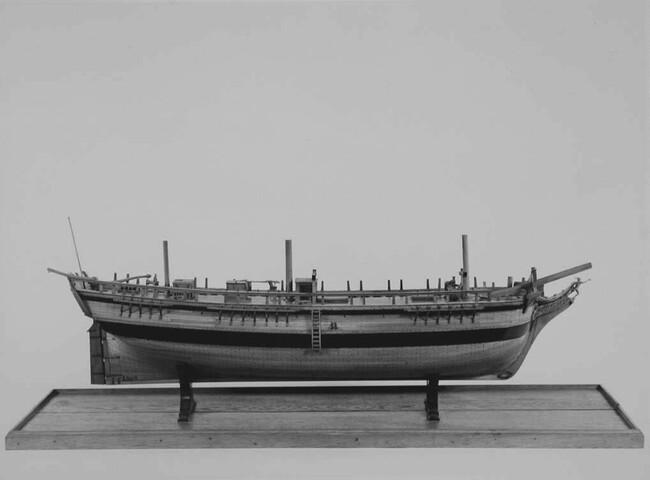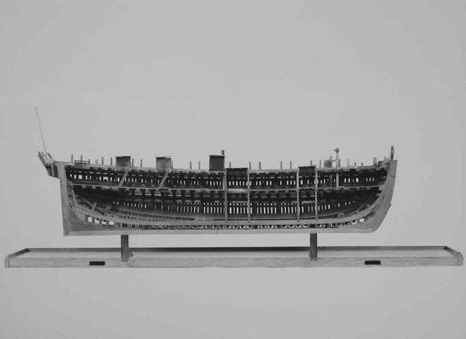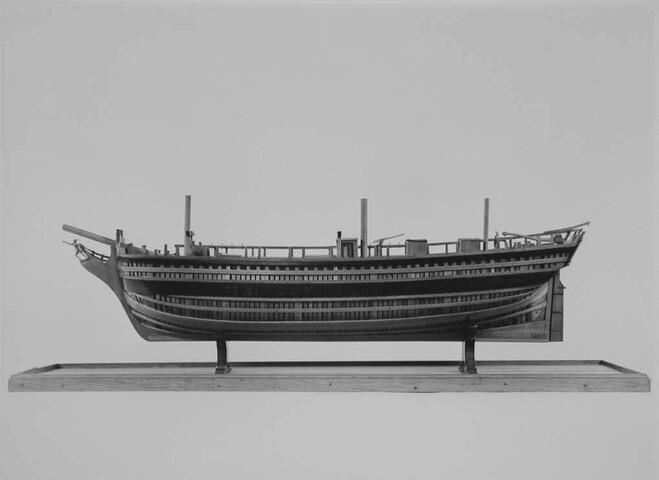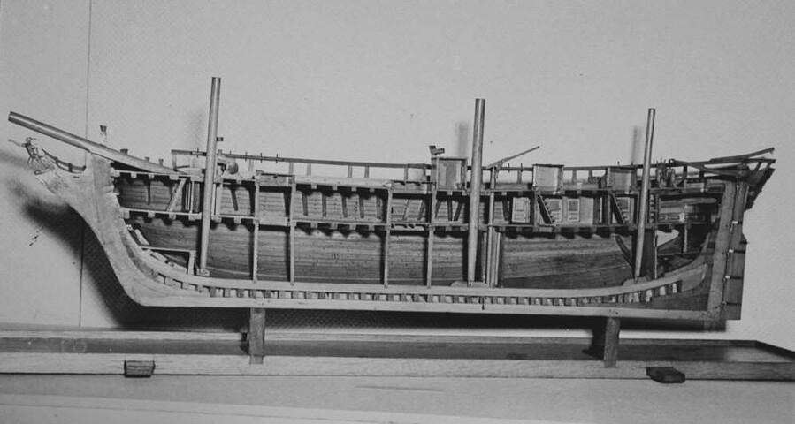 In twee helften deelbaar rompmodel van het driemastschip Cornelis Houtman. Tweedekker zonder bak of campagne. Geen gesloten verschansing, slechts een open reling. Het model is volgens het vlak van kiel en stevens doorgesneden. Een der helften is open bewerkt, zodat niet alleen de inwendige verdeling, maar ook de gehele constructie goed is te zien.