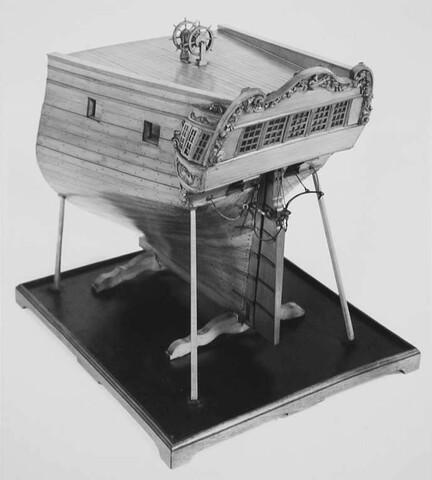 Model van een achterschip van een groot zeilschip met noodstuurinrichting.
