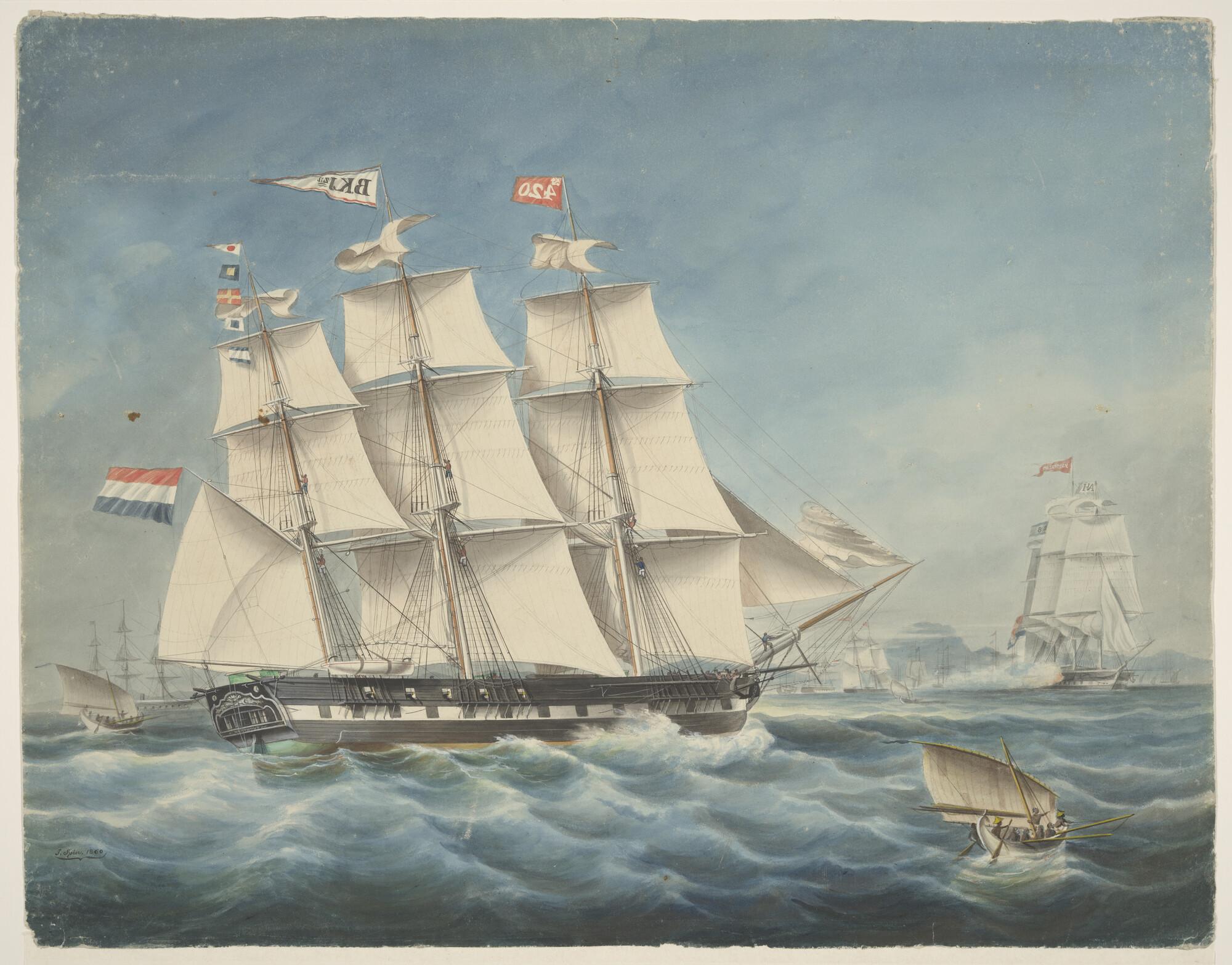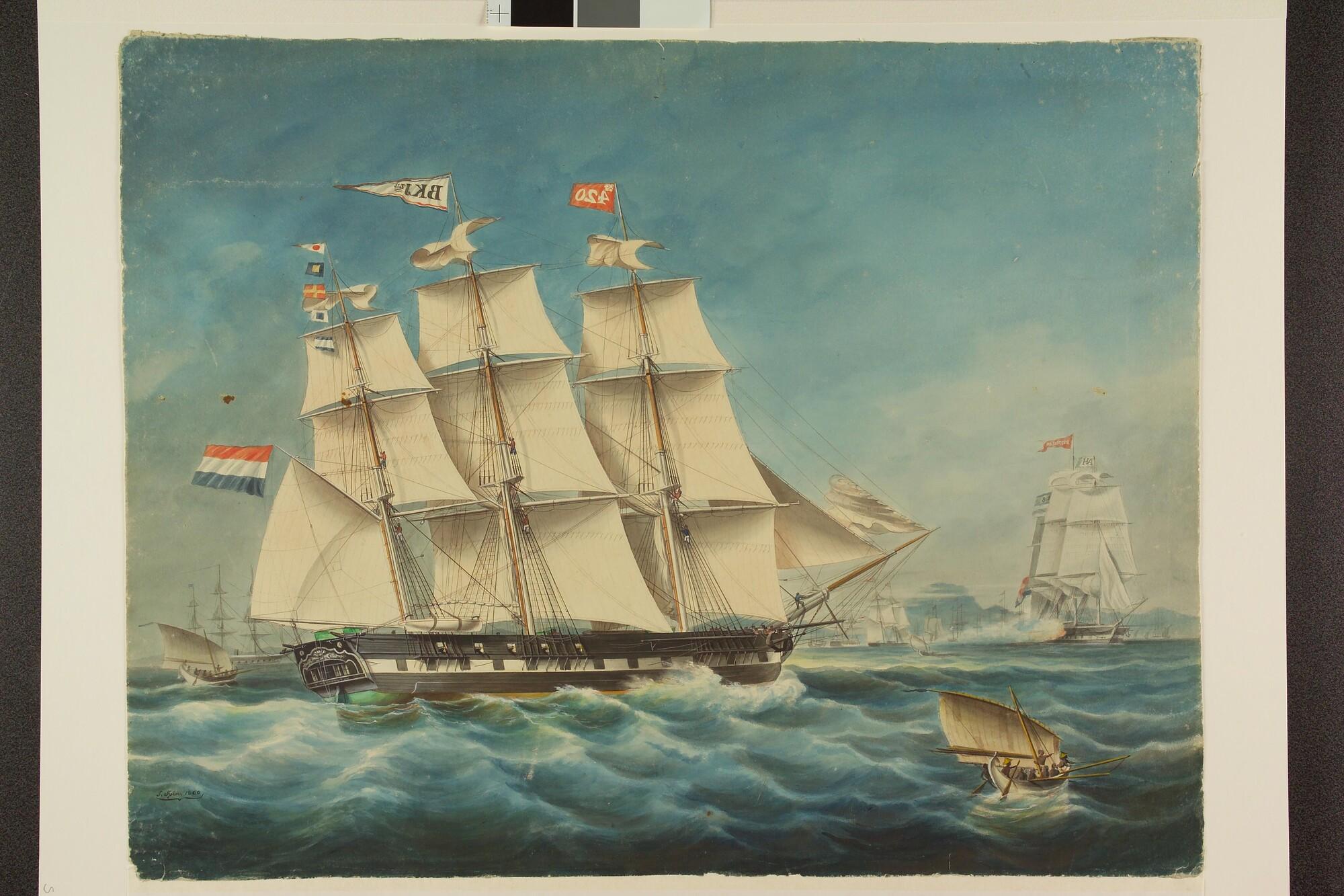 Het fregatschip Neptunus op de rede van Batavia, rechts op de achtergrond het fregat Rotterdam.