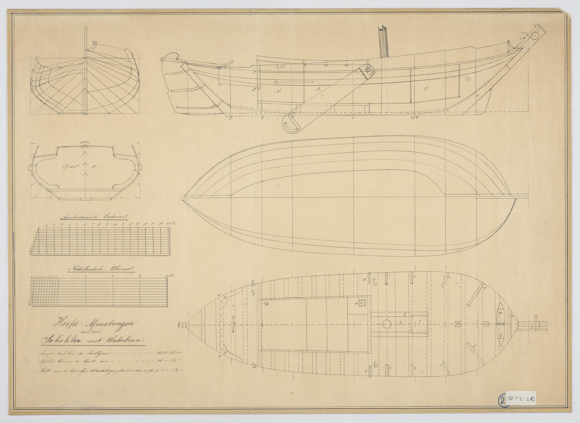 Zijaanzicht, vooraanzicht, achteraanzicht, bovenaanzicht, dwarsdoorsnede, verticalen van een schokker. (met waterbun). Afmetingen 44.4½ x 14.2¼ x 5.7 3/4.