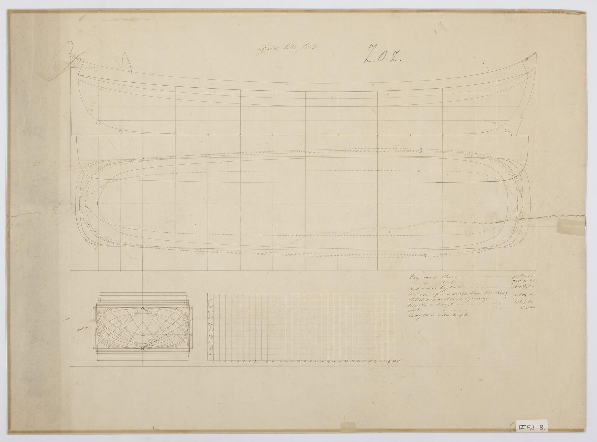 Lijnenplan van een tjalk "Catharina", 1858. Lang 77.8½ voet.