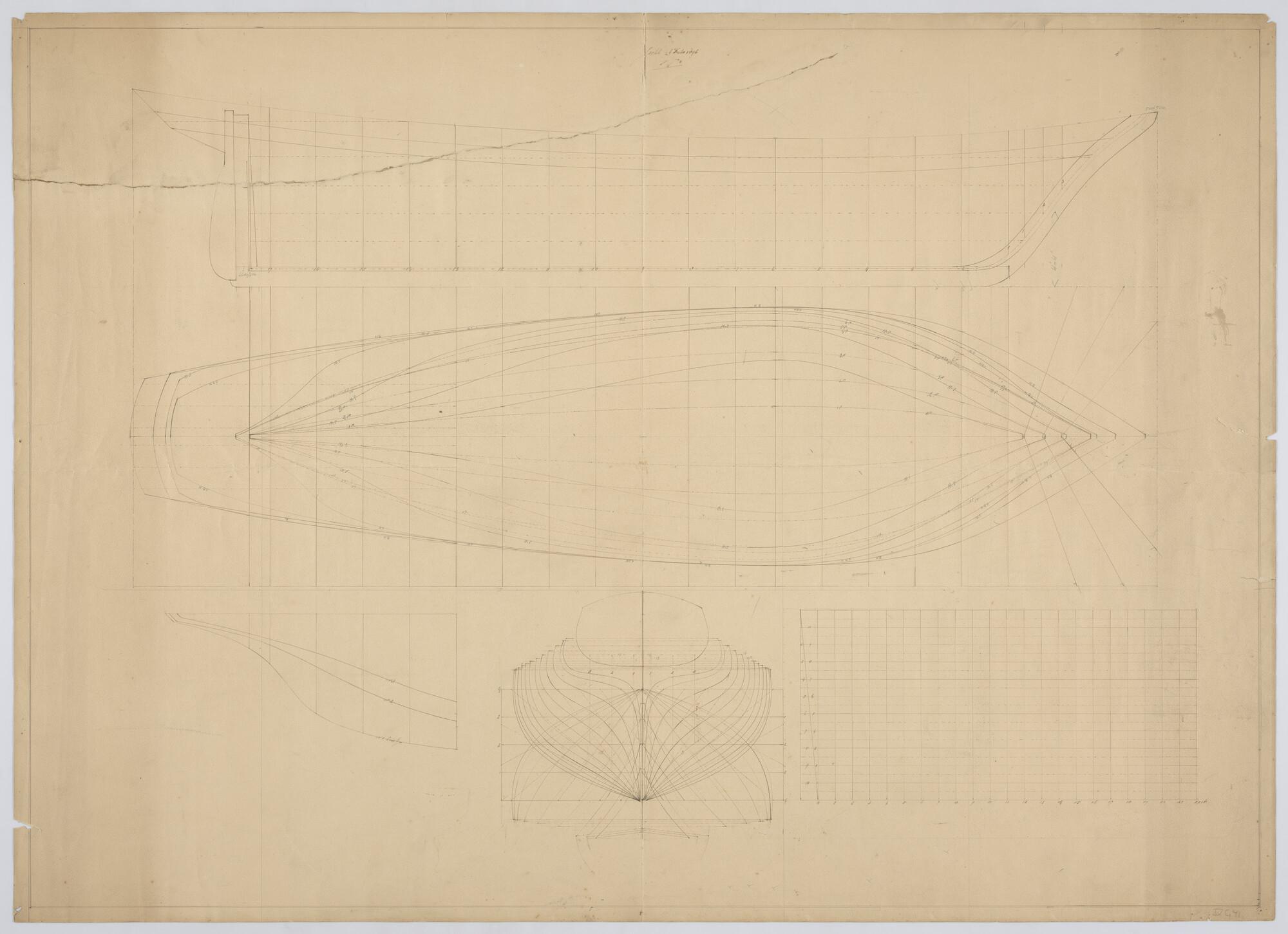 Lijnenplan, met spantenraam en waterlijnen van een zeiljacht 1896.