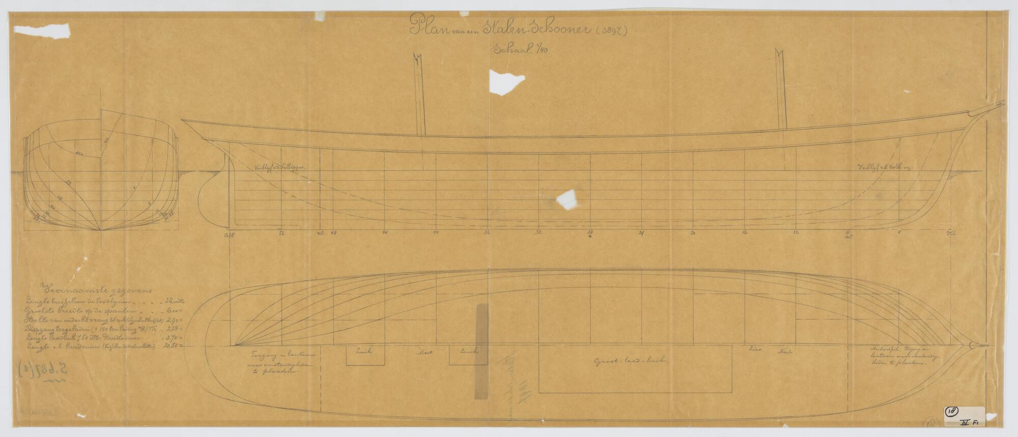 Stalen loodsschoener 1897: zijaanzicht, bovenaanzicht, vooraanzicht, achteraanzicht, spantenraam, waterlijnen, verticalen, zijaanzicht, met zeilplan. Lang 28 meter.
