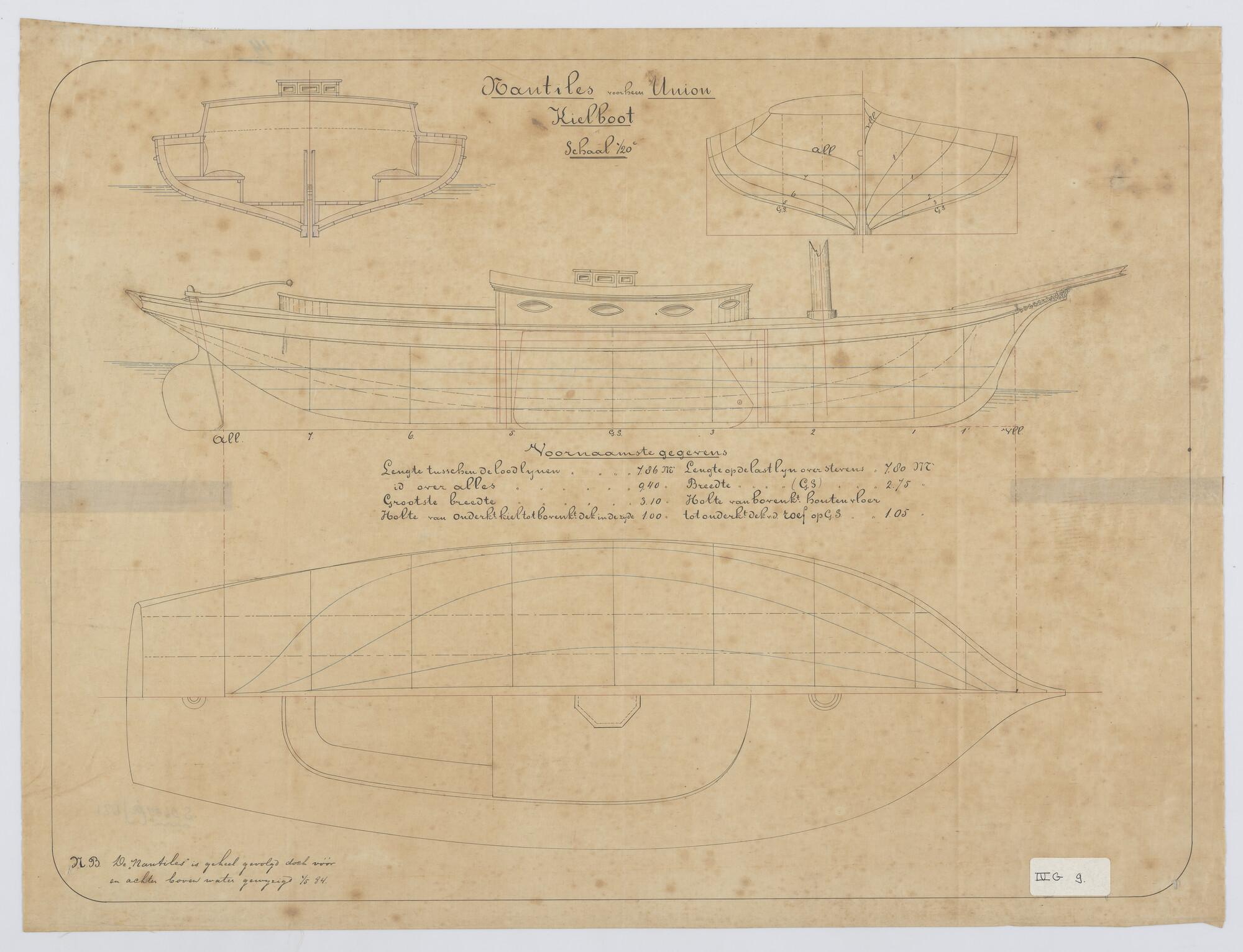 Bovenaanzicht, vooraanzicht, achteraanzicht, zijaanzicht, dwarsdoorsnede, waterlijnen van het midzwaardjacht "Nautilus". (Ex "Union"). Afmetingen 7.86 x 3.10 x 1 meter.