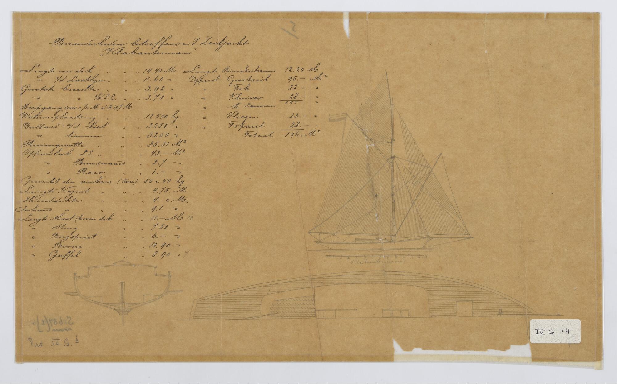 Bovenaanzicht, grootspant, zeilplan. zijaanzicht, vooraanzicht, achteraanzicht, waterlijnen van midzwaardjacht 'Nellie' type Klabauterman, 1887. Afmetingen 11.6 x 3.92 meter.