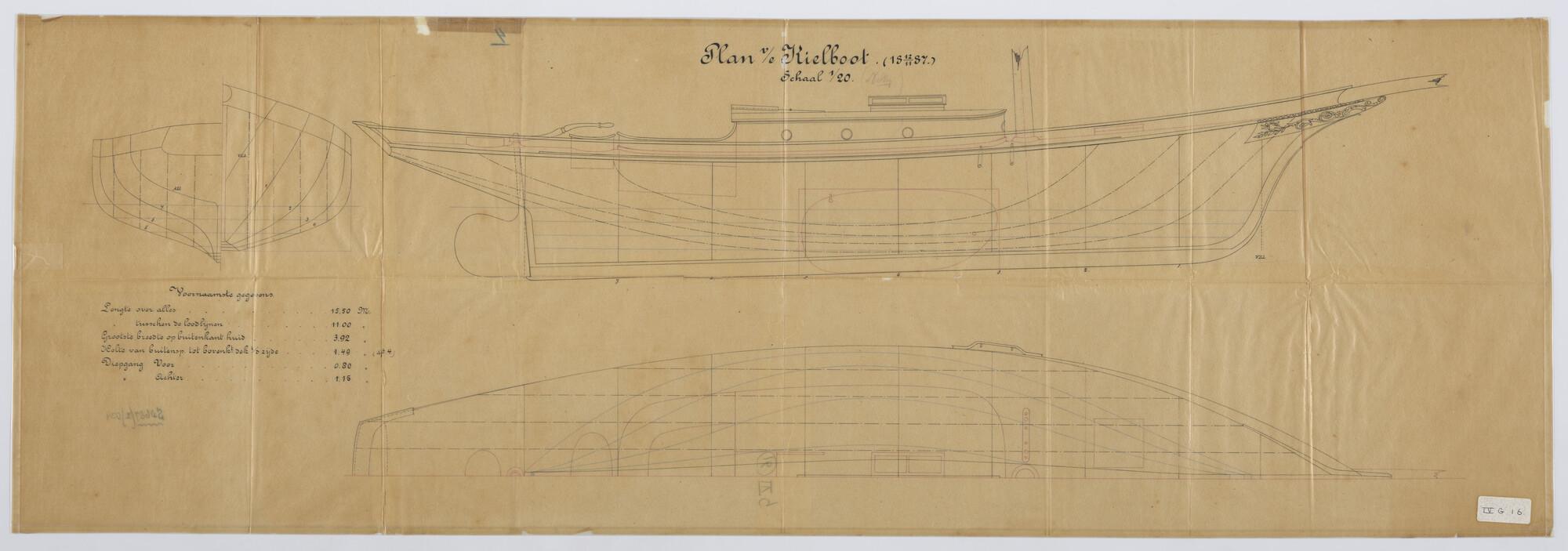 Zijaanzicht, vooraanzicht, achteraanzicht, bovenaanzicht, waterlijnen, verticalen, zijaanzicht met zeilplan van midzwaardjacht 'Nellie' 1887. Afmetingen 11 x 3.92 x 1.49 meter.