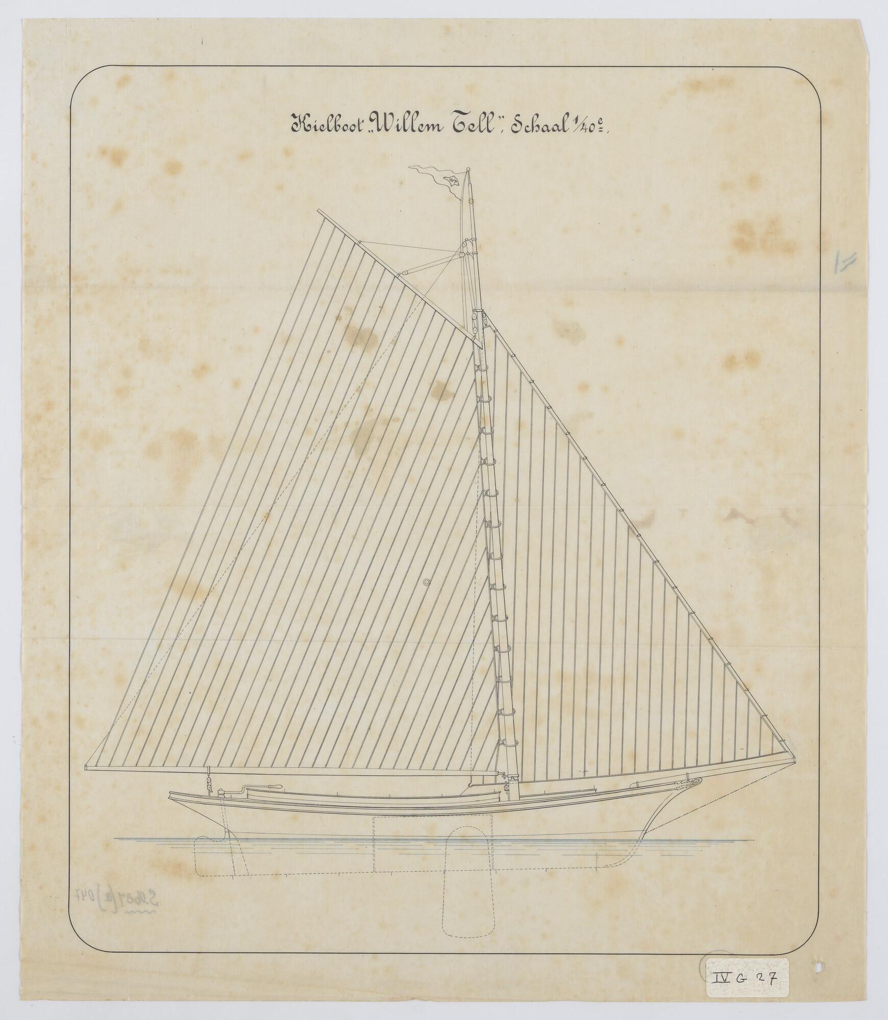 Zijaanzicht met zeilplan van het midzwaardjacht Zwerver (ex Willem Tell) 1884
