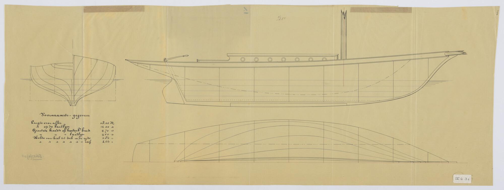 Zijaanzicht, vooraanzicht, achteraanzicht, spantenraam, verticalen, waterlijnen van zeiljacht 'Nevermind' in 1891 gebouwd door werf Heidtmann in Hamburg voor eigenaar Van Gheel Gildemeester. Afmetingen van het schip 18,35 x 4.70 x 1.86 meter. dit lijnenplan is een op de werf Het Jacht gemaakte kopie van het originele lijnenplan.