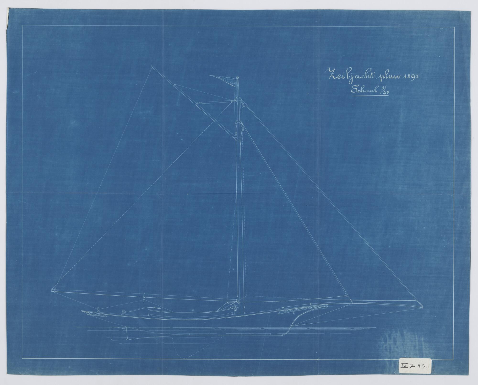 Midzwaardjacht 1893. Zijaanzicht met zeilplan. zijaanzicht, bovenaanzicht, vooraanzicht, achteraanzicht, spantenraam, verticalen, grootspant van een midzwaardjacht Afmetingen 8.14 x 3.74 x 0.71 meter.