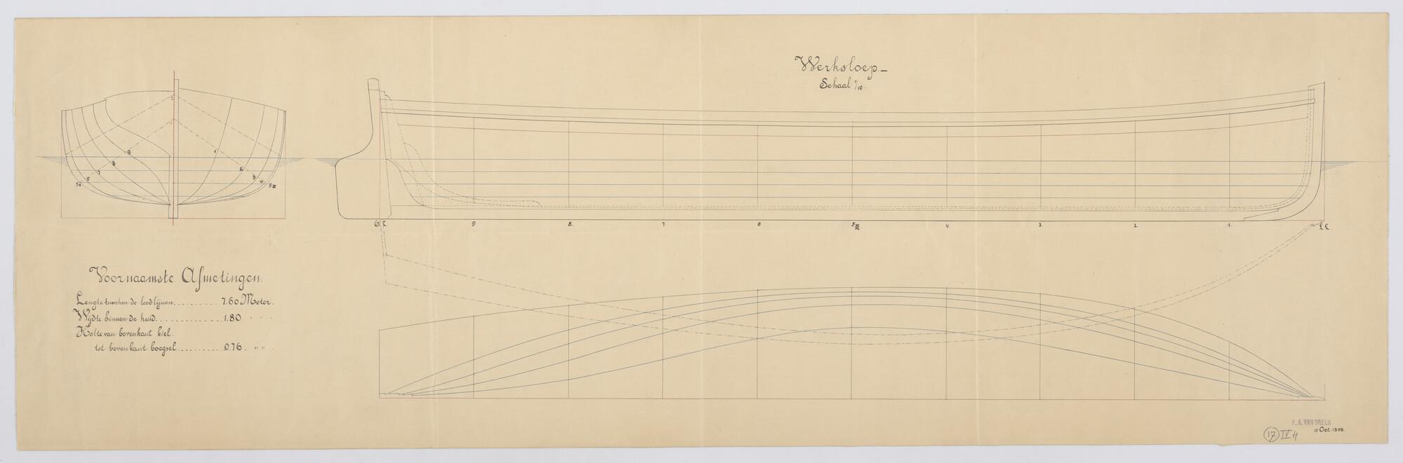 Werksloep, 1898. Zijaanzicht, spantenraam, senten en waterlijnen van een Werksloep. Afmetingen 7.60 x 1.80 x 0.76 meter.