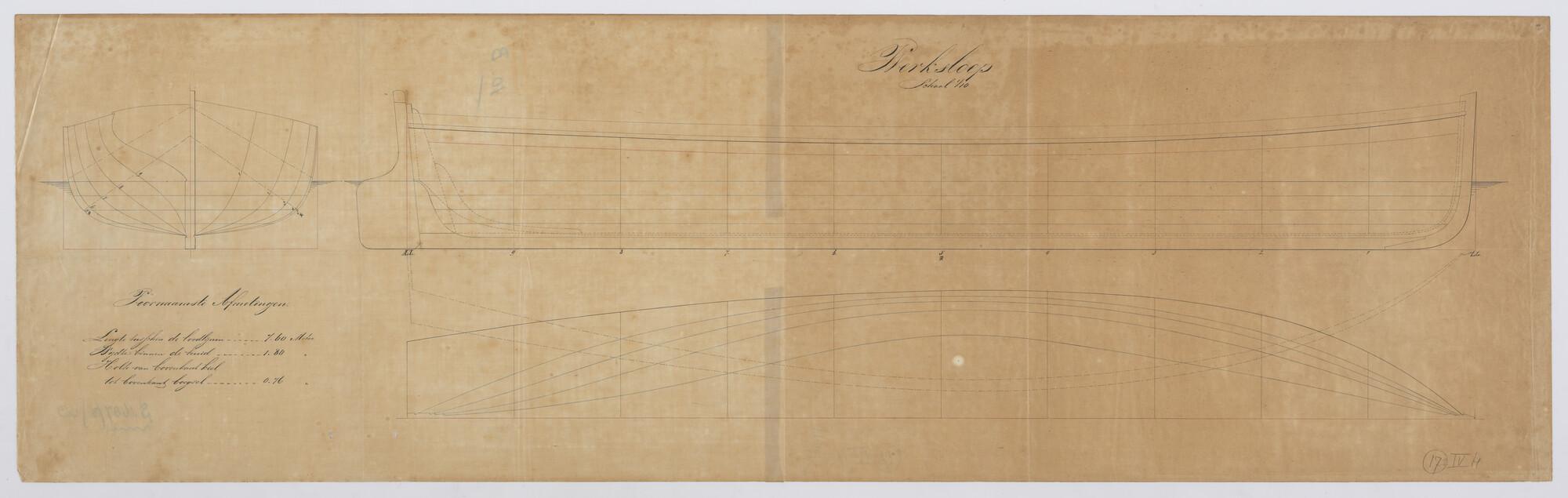 Werksloep, 1898. Zijaanzicht, spantenraam, senten en waterlijnen van een Werksloep. Afmetingen 7.60 x 1.80 x 0.76 meter.