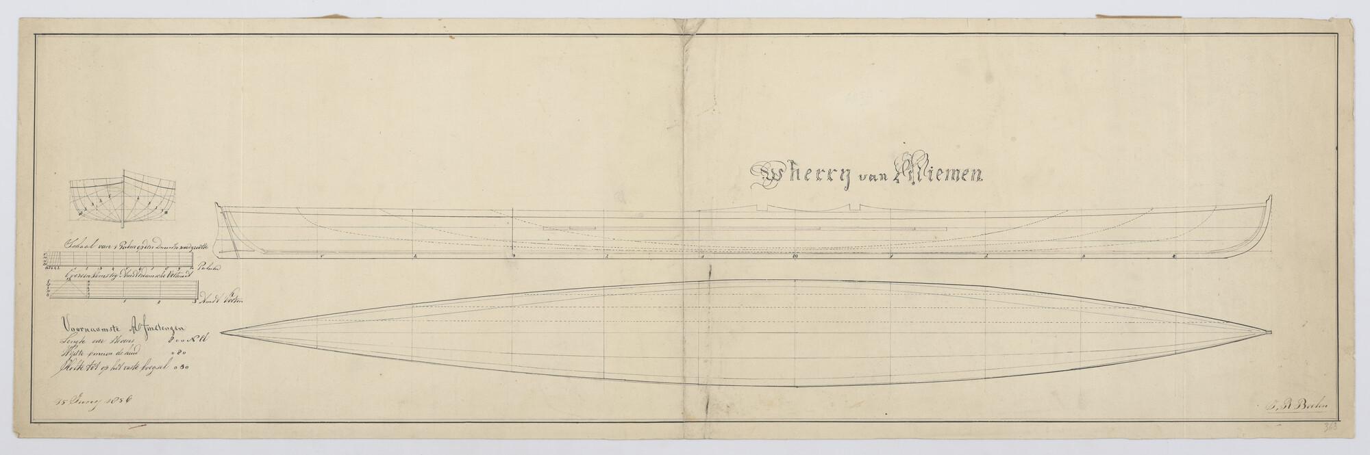 Zijaanzicht, vooraanzicht, achteraanzicht, waterlijnen, senten, spantenraam en verticalen van een Wherry (vierriems), 1856. Afmetingen 8 x 0.8 x 0.3 el.