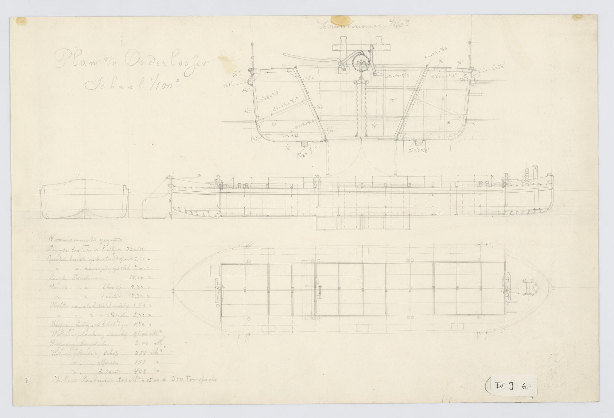 Bovenaanzicht, zijaanzicht, vooraanzicht en dwarsdoorsnede van een Onderlosser 1887 ijzer.