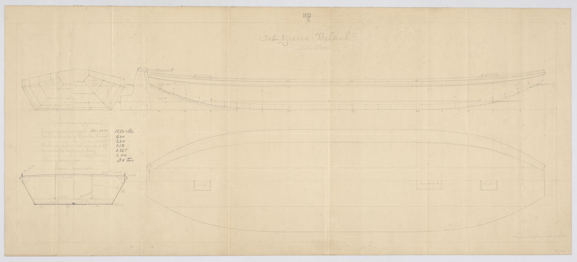Verticale langsdoorsnede, bovenaanzicht, vooraanzicht, achteraanzicht, dwarsdoorsnede en Onderaanzicht van een ijzeren dekaak, 1893. Lengte 15.50 meter.